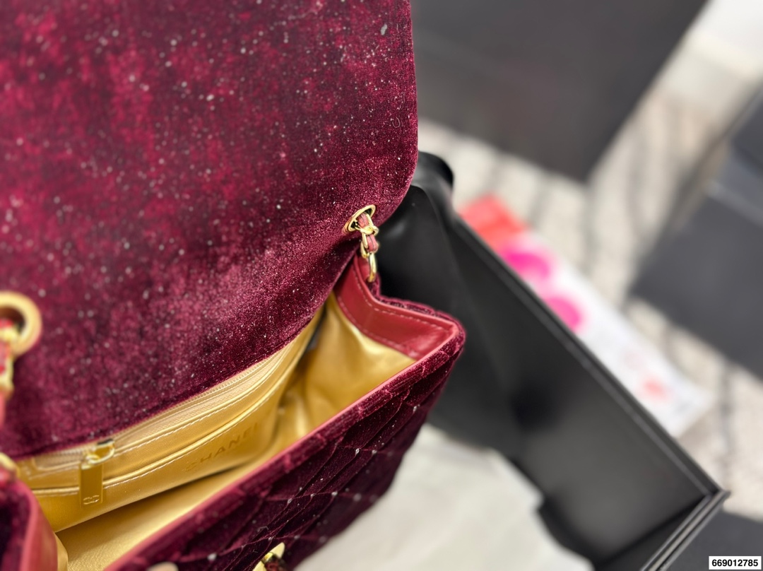 DetailChanel Velvet Diamond Ball Chain Square Fat BagAs elegant as a rich red velvet cakeA unique vintage charmAwakens inner elegance~Embody the look of a wealthy young lady! The entire bag is made of velvet.The gold balls are rare, sparkling diamond balls, and they're even double balls! So cute!This can be worn in any season; velvet has its own halo.