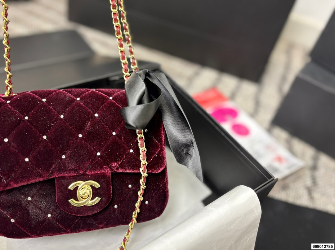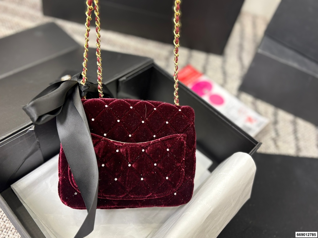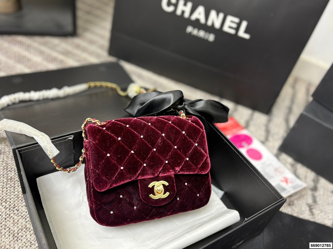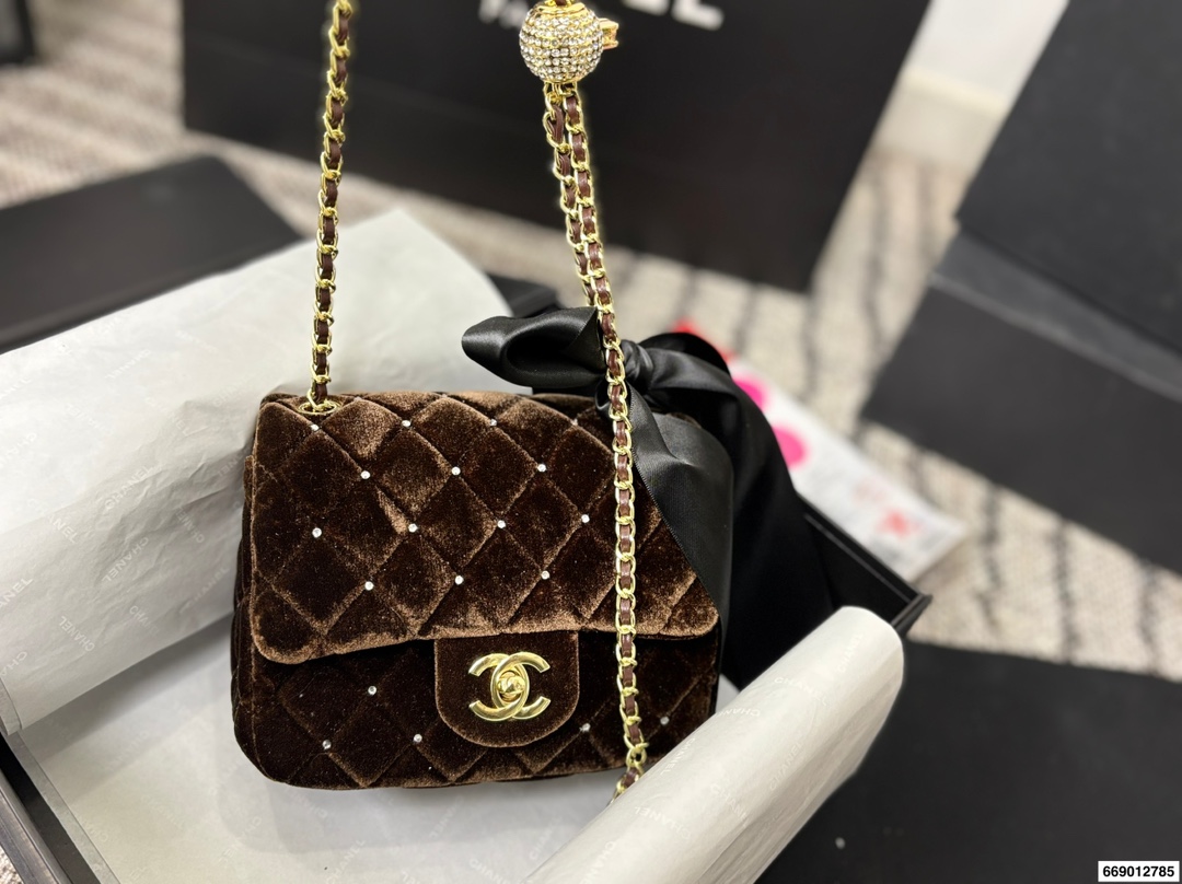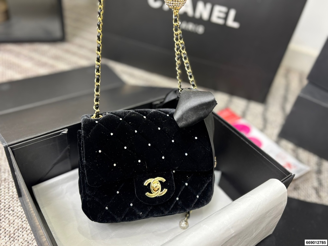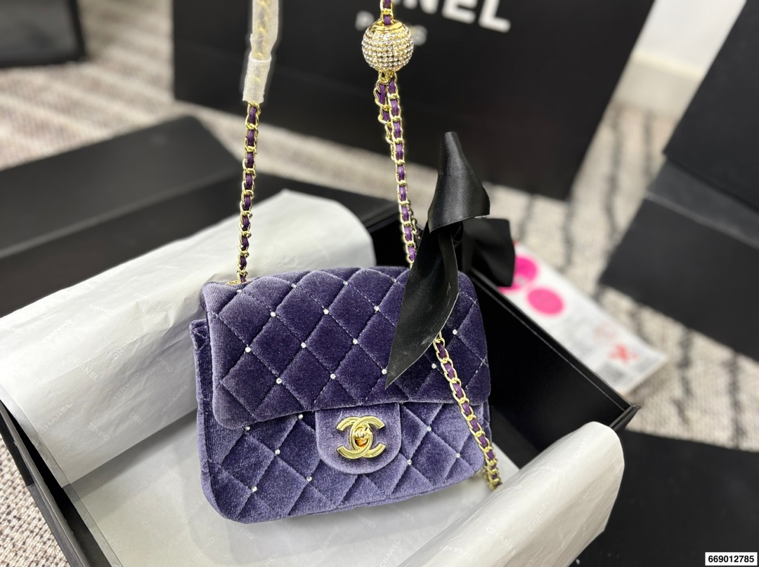 Chanel Velvet Diamond Ball Chain Square Fat Bag