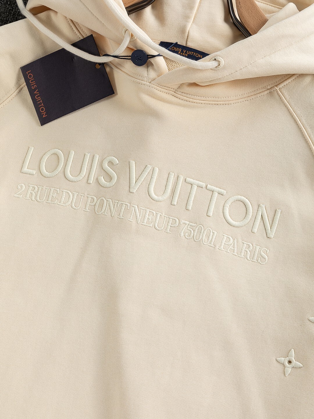 DetailLouis Vuitton 25SS Early Autumn/Winter Hooded Sweatshirt. Features a simple embroidered logo on the chest. Made of pure cotton, it's comfortable against the skin, stylish, and easy to wear. The classic, minimalist logo design is uniquely eye-catching. This LV hooded sweatshirt boasts excellent quality and comfort, maintaining the classic fit and fashionable look. The attention to detail in the fabric and tailoring is evident throughout.