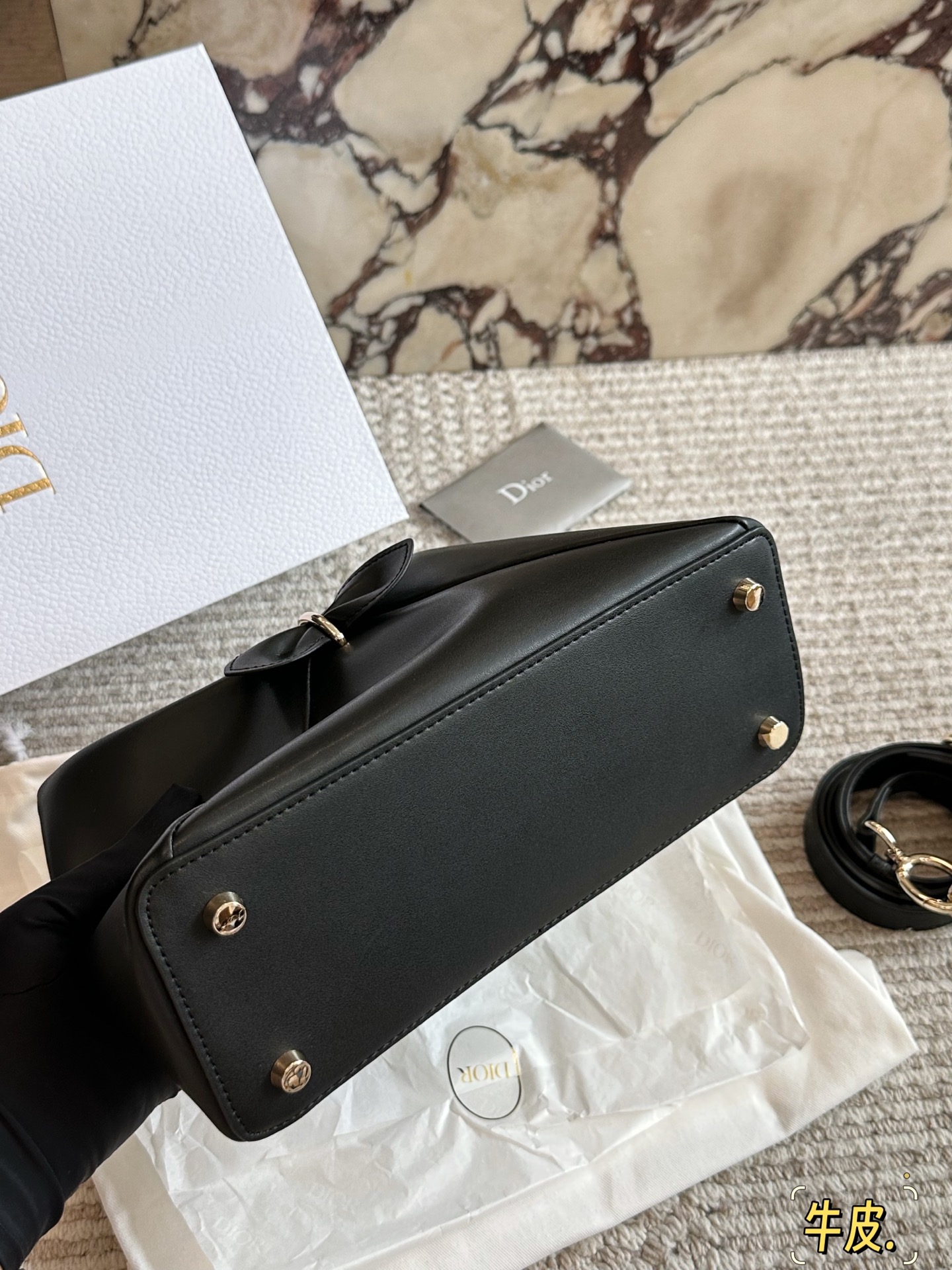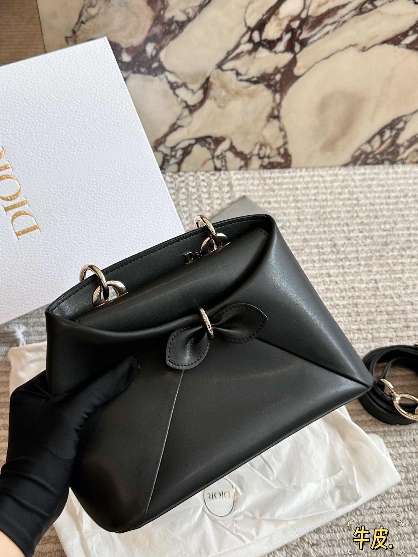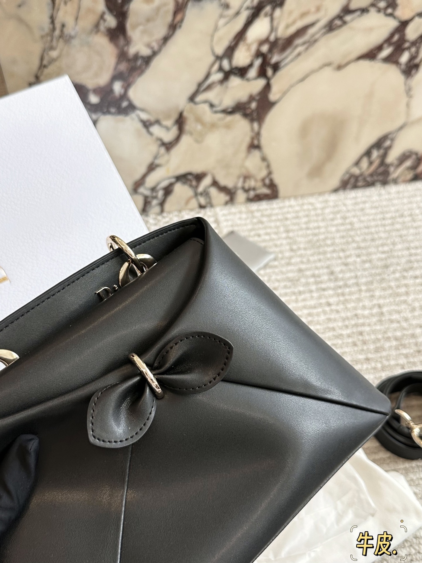 DetailThe Dior Spring/Summer 2026 bow tote bag, designed by Jonathan Anderson, draws inspiration from elements in the brand's archives. Crafted from black leather, it features a three-dimensional bow and metal clasp on the front, exuding elegance and distinctiveness. The handle incorporates the "Dior" monogram, showcasing impeccable detail. Its moderate size allows for hand-carrying or shoulder-carrying, making it suitable for both commuting and formal occasions. With its architectural silhouette and modern aesthetics, it combines style and practicality, making it a truly eye-catching piece this season!