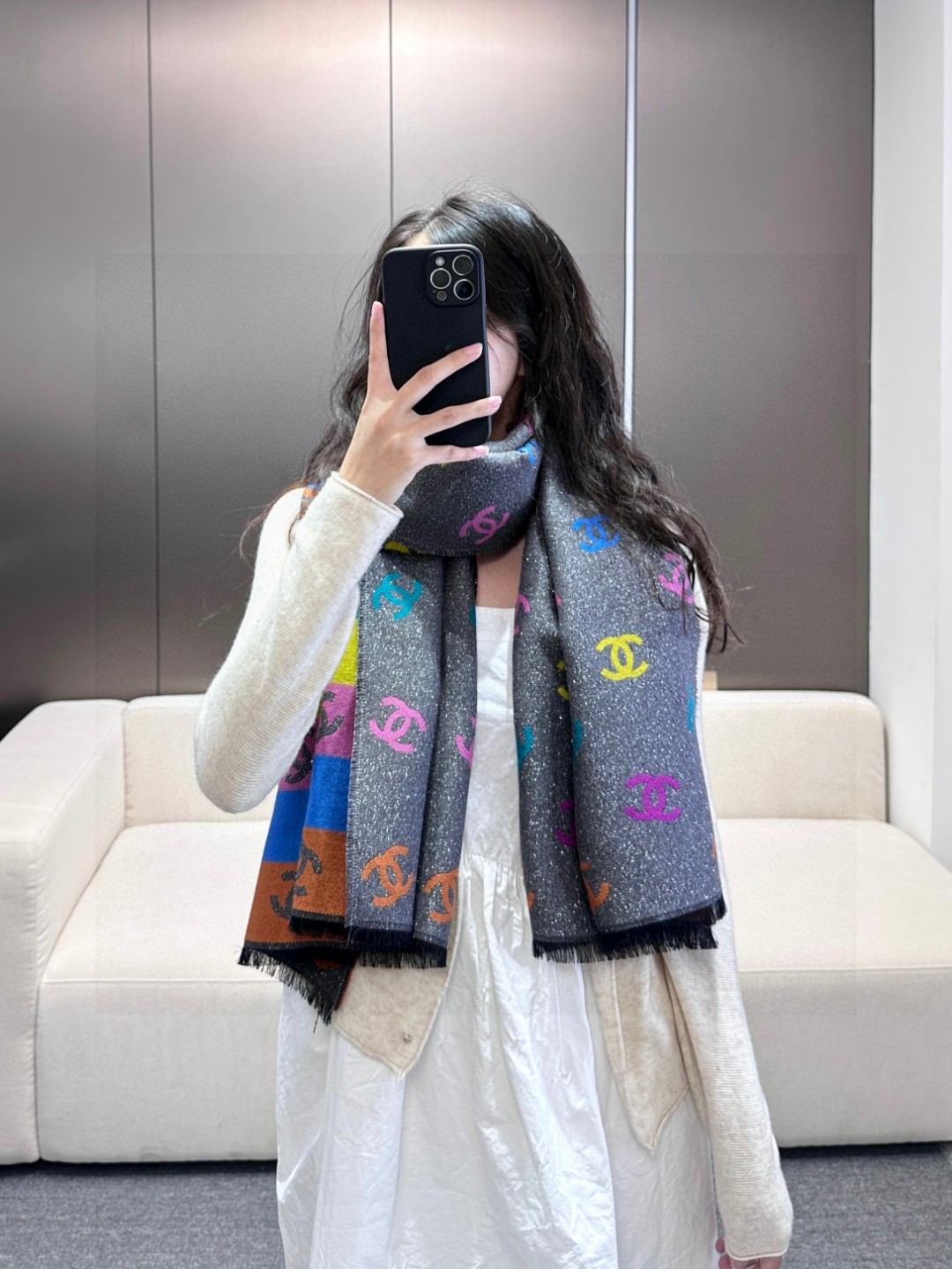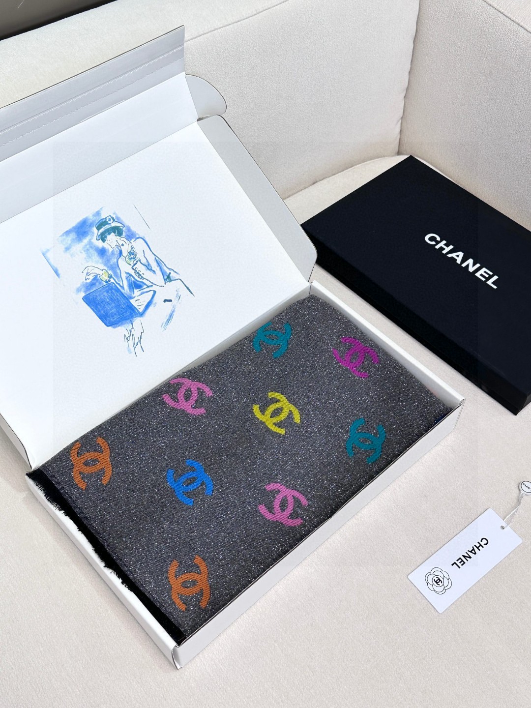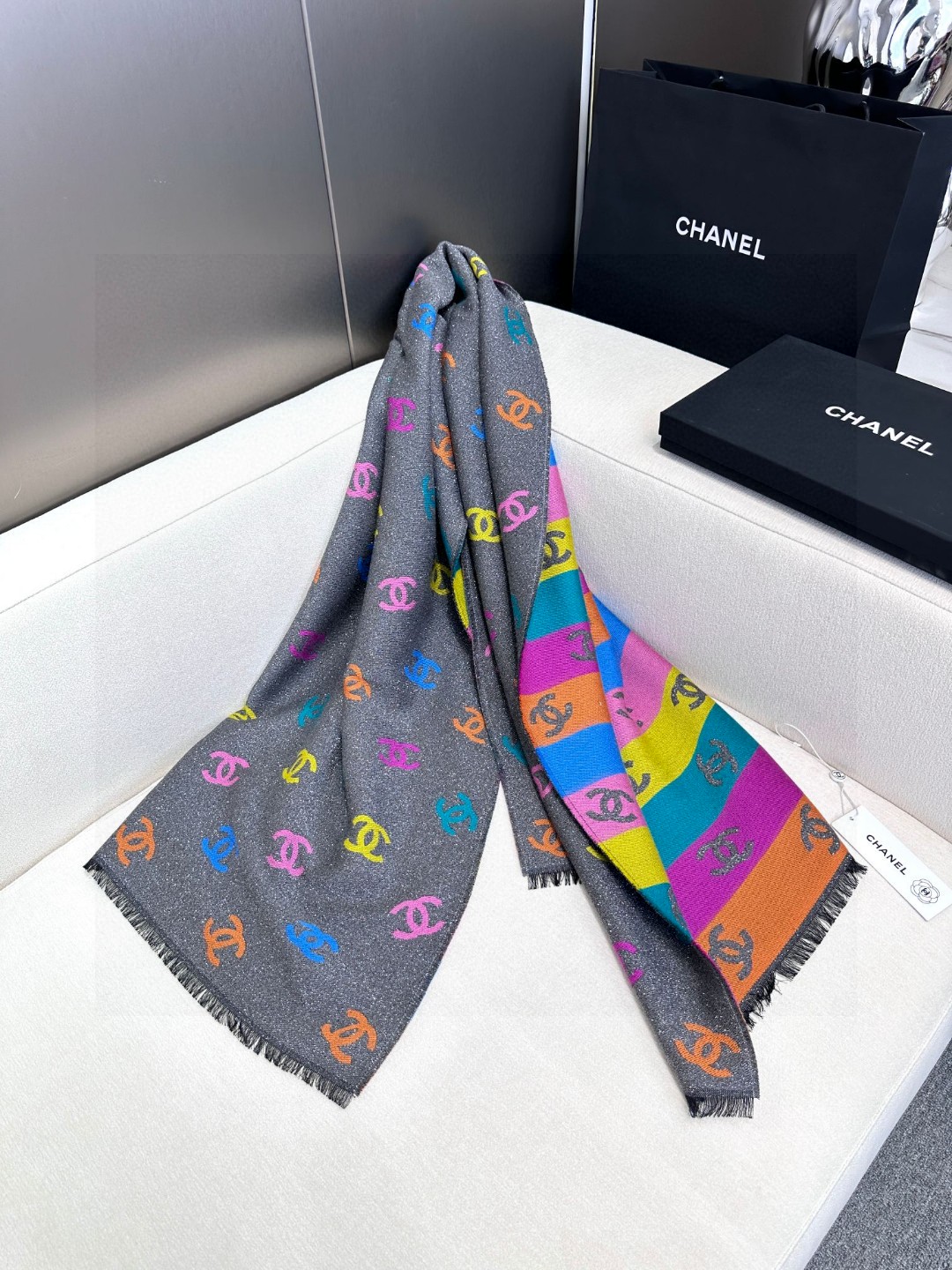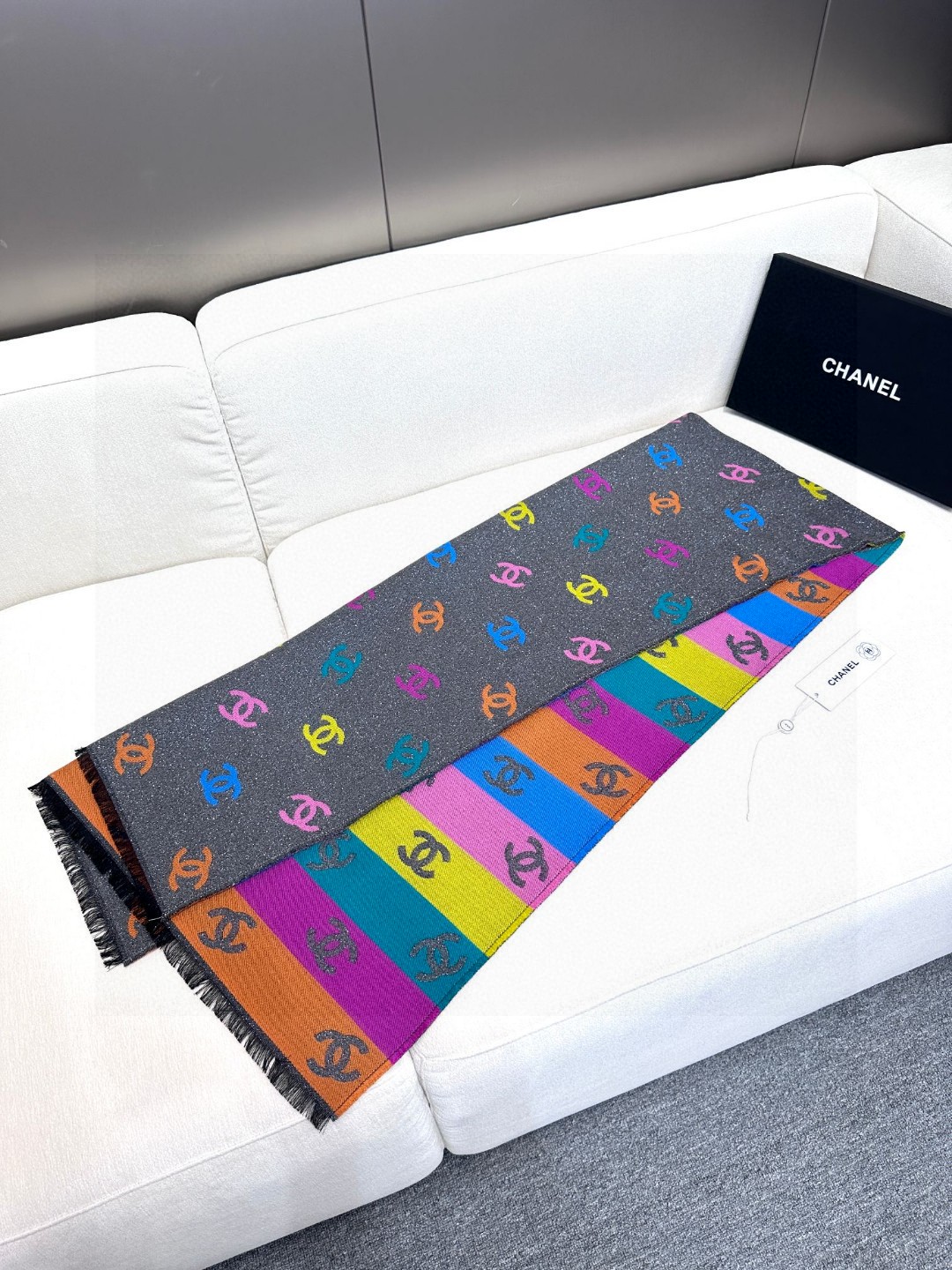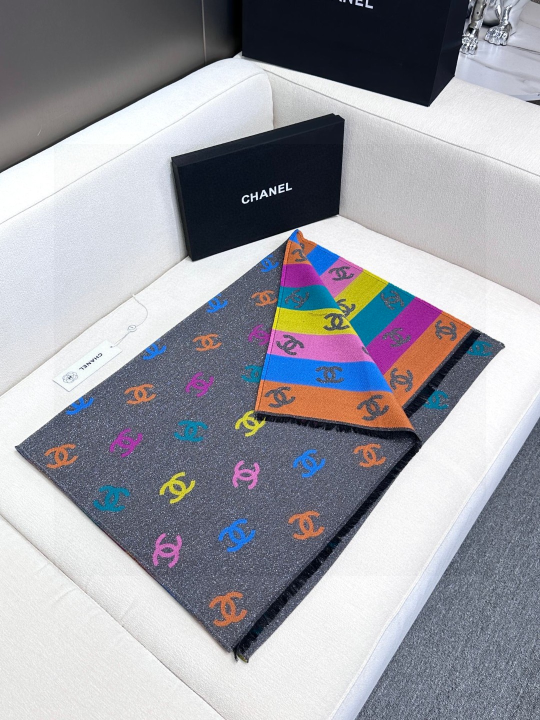 DetailThe feel is softer than I imagined. Both sides are excellent. The black side has a base color with fine glitter, and the colored side has a logo with fine glitter. Both sides are excellent. Compared to the same old things, I always love these details of Chanel. If you are tired of black and white, a colorful scarf would be very nice.