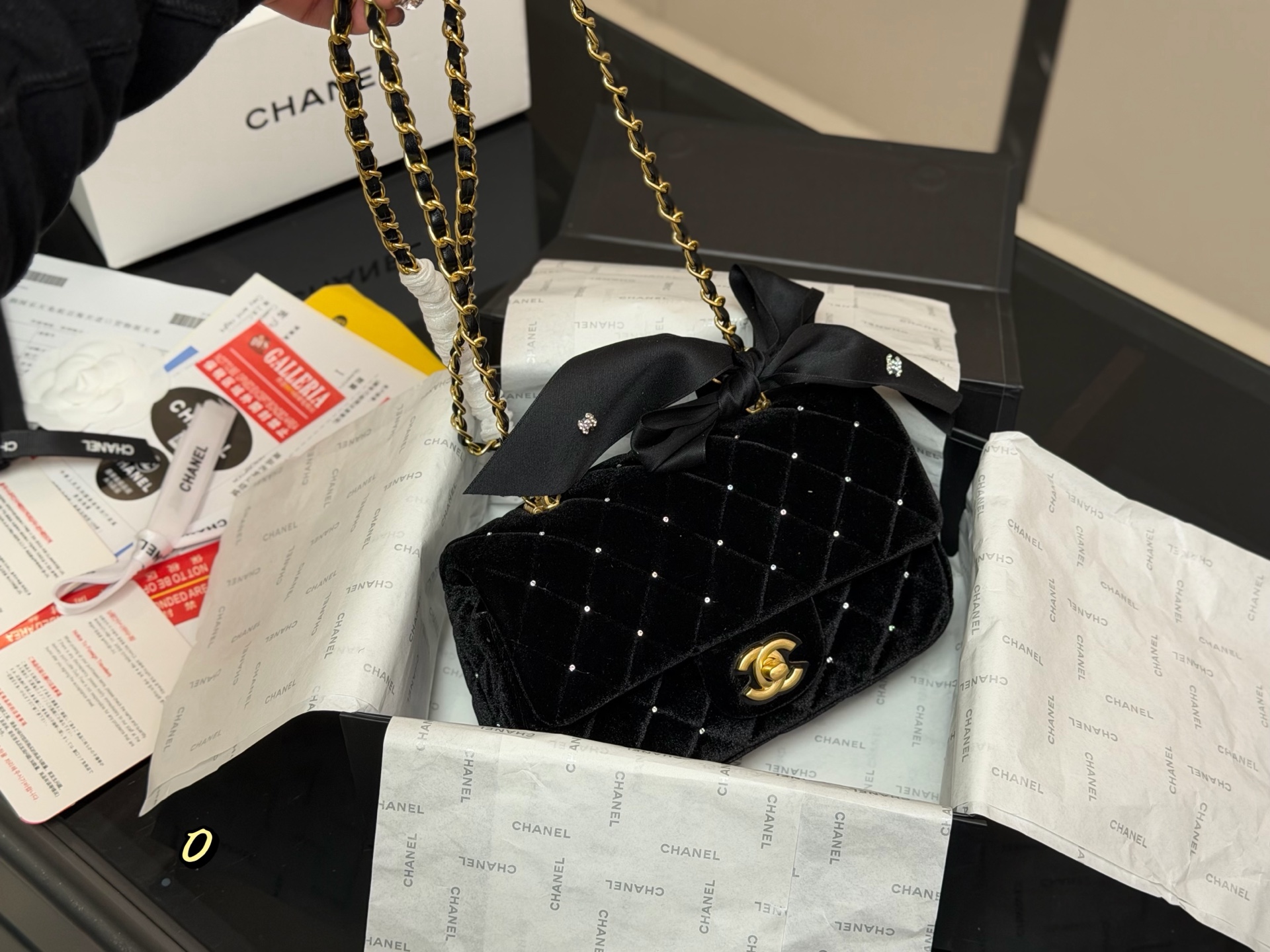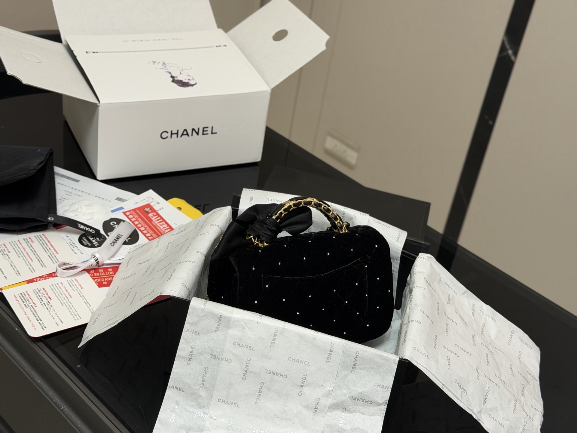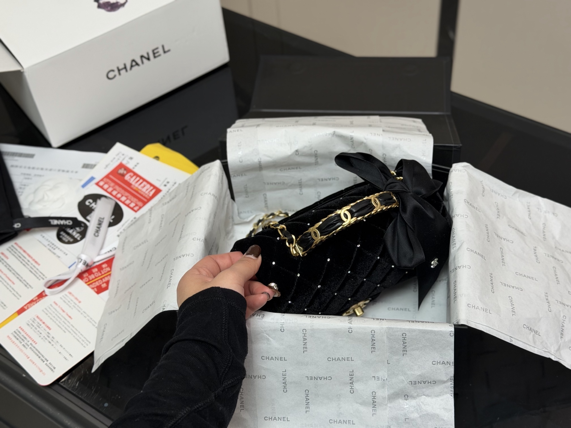 DetailThe Chanel 25k bow bag. The moment I held it, its luxurious feel was overwhelming! The classic black color and the incredibly delicate velvet texture give it a subtle sheen under light! What I love most is the three-dimensional leather bow! It's not childish at all; it adds just the right amount of sweetness and liveliness—simply stunning!