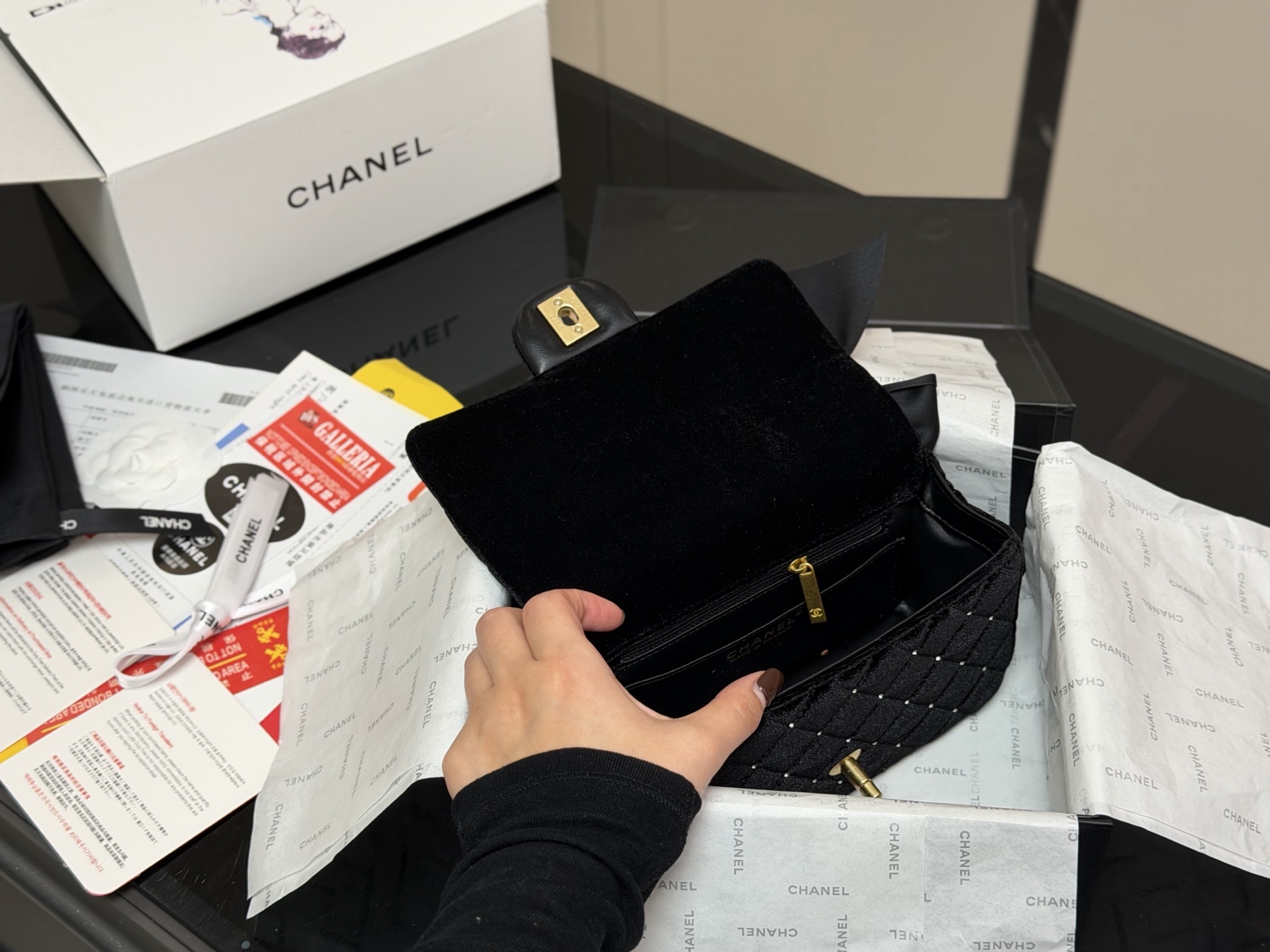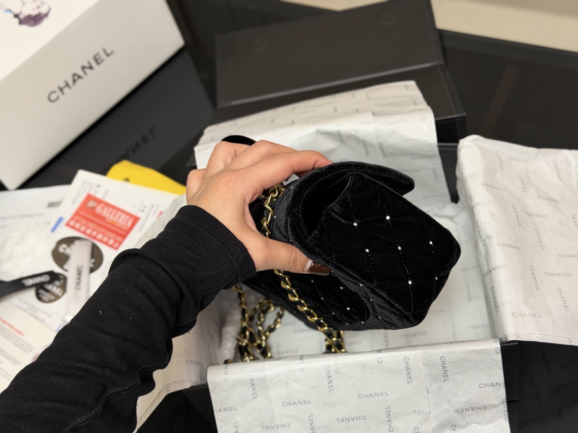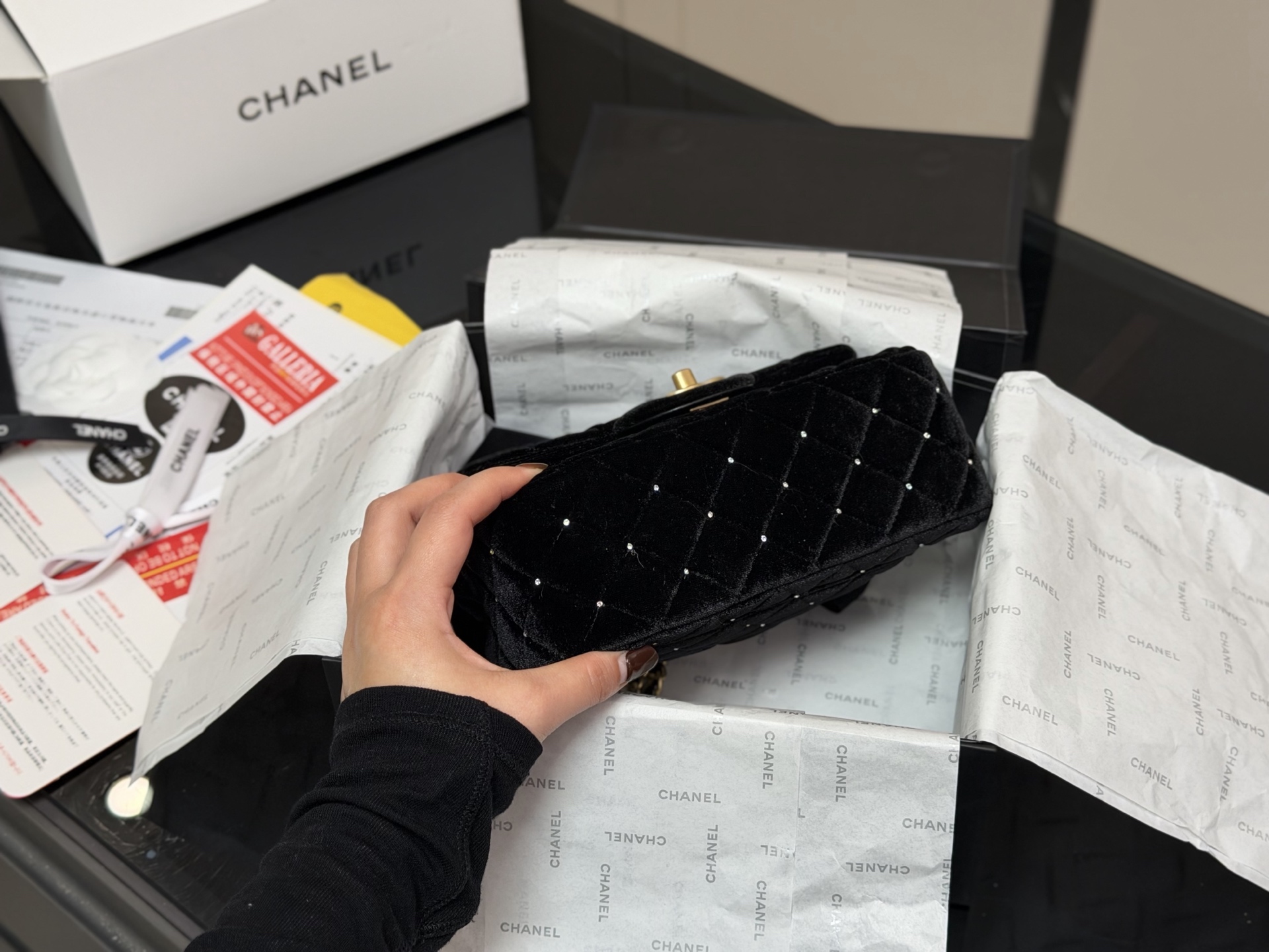 DetailThe Chanel 25k bow bag. The moment I held it, its luxurious feel was overwhelming! The classic black color and the incredibly delicate velvet texture give it a subtle sheen under light! What I love most is the three-dimensional leather bow! It's not childish at all; it adds just the right amount of sweetness and liveliness—simply stunning!