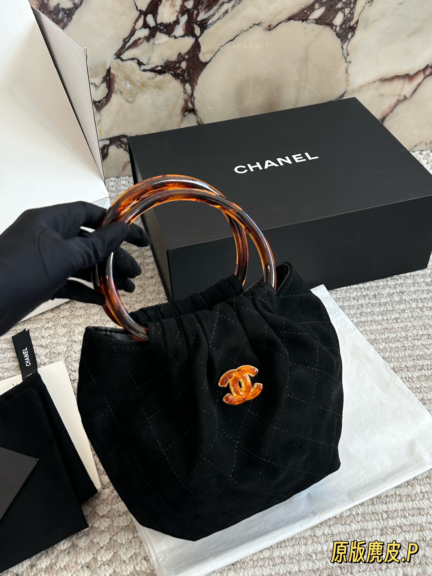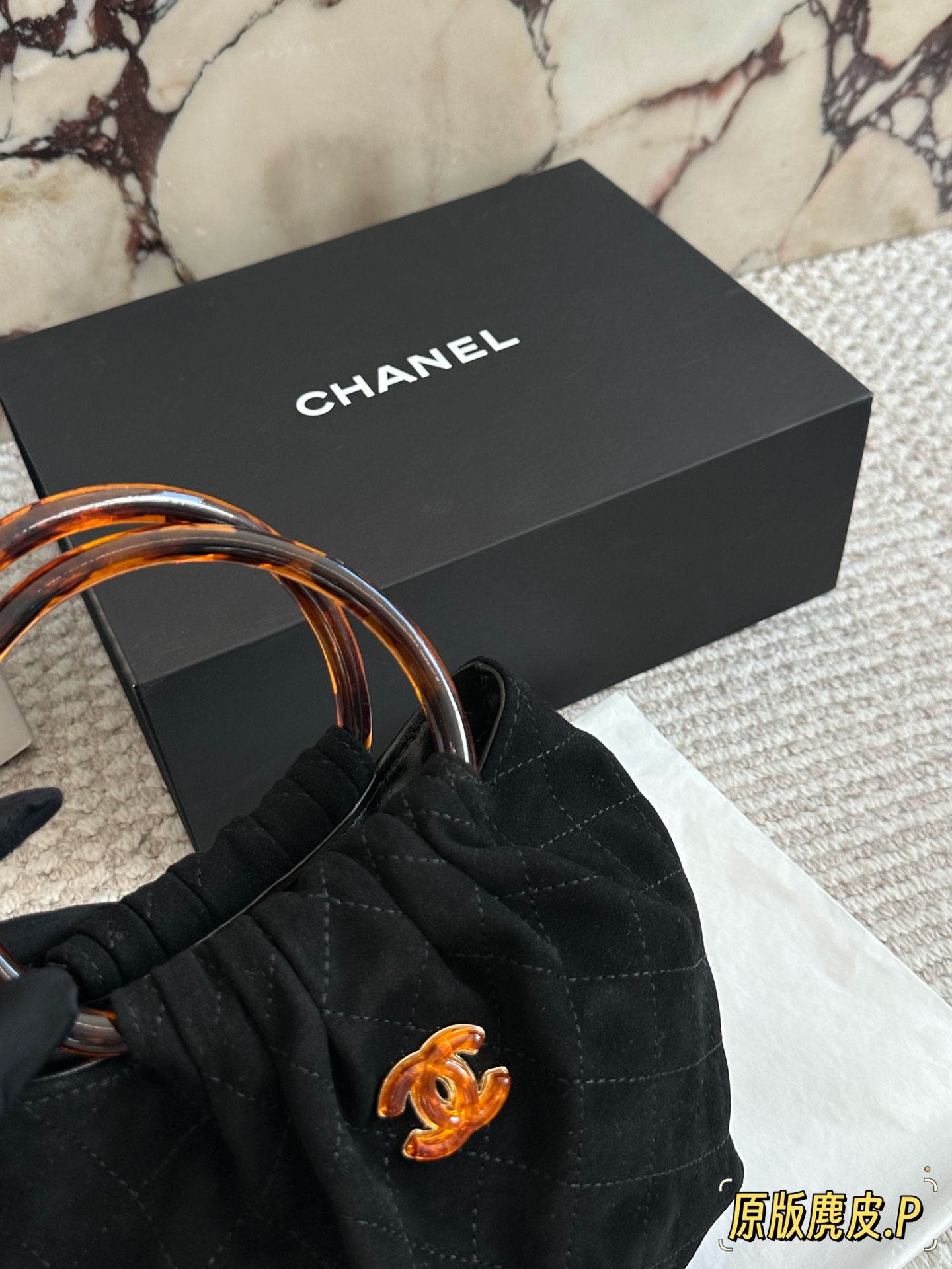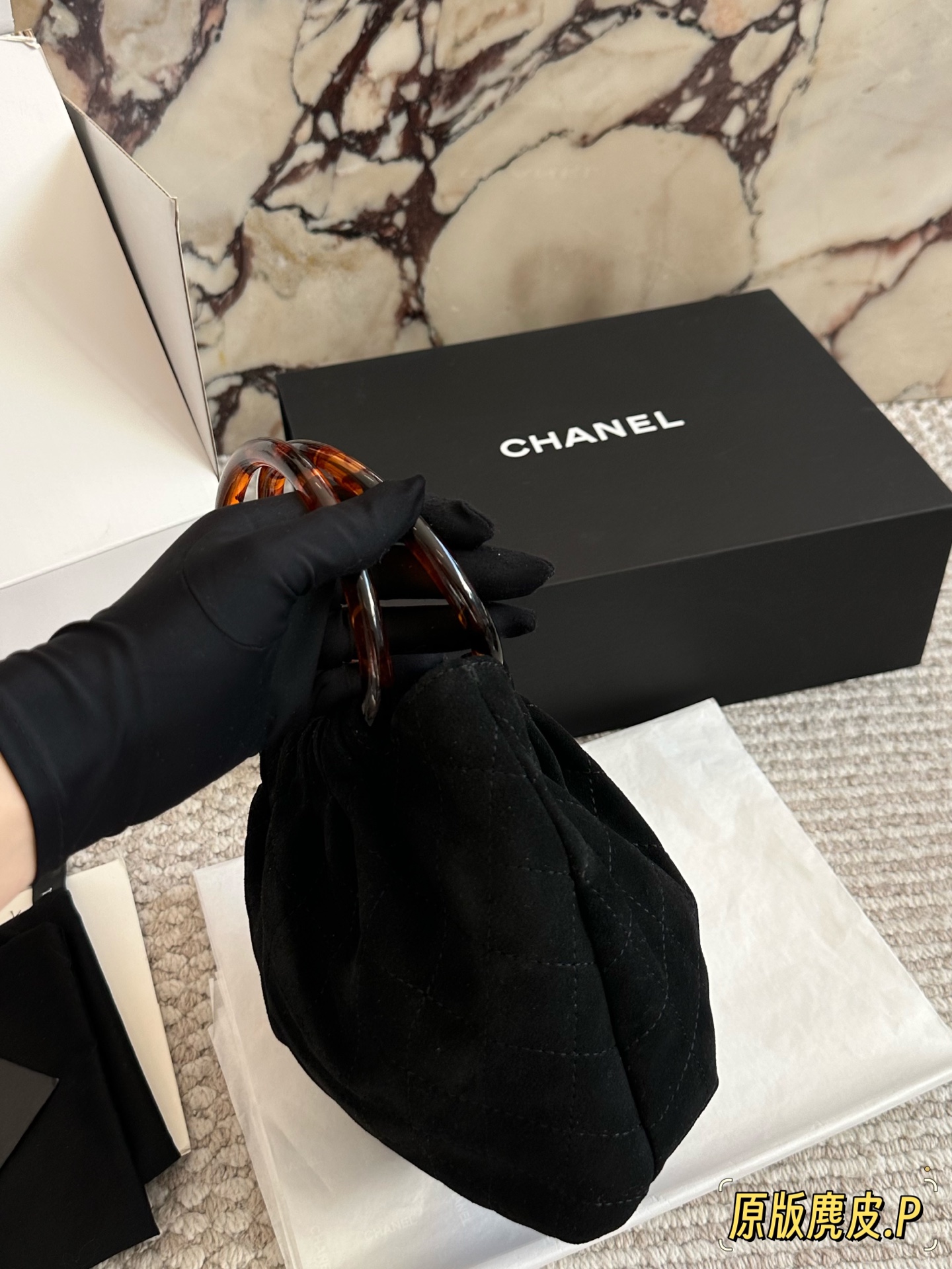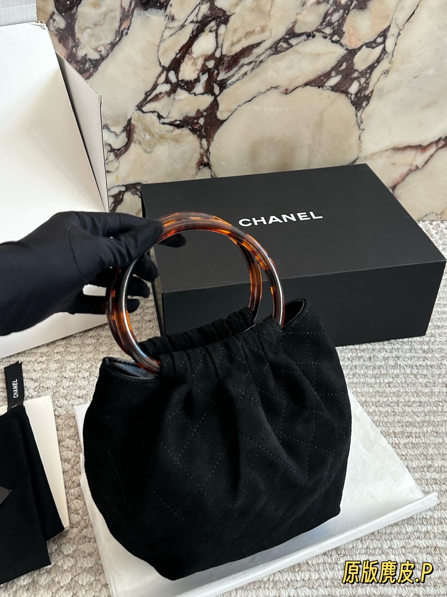 DetailChanel 26C suede tote bag. The vintage tortoiseshell handle has a subtle sheen. It's so elegant to carry by hand! The double-C tortoiseshell logo in the center adds a touch of dynamism. The capacity is also quite generous; it can easily fit a phone and everyday essentials. The suede material feels wonderful to the touch! Perfect for autumn and winter.