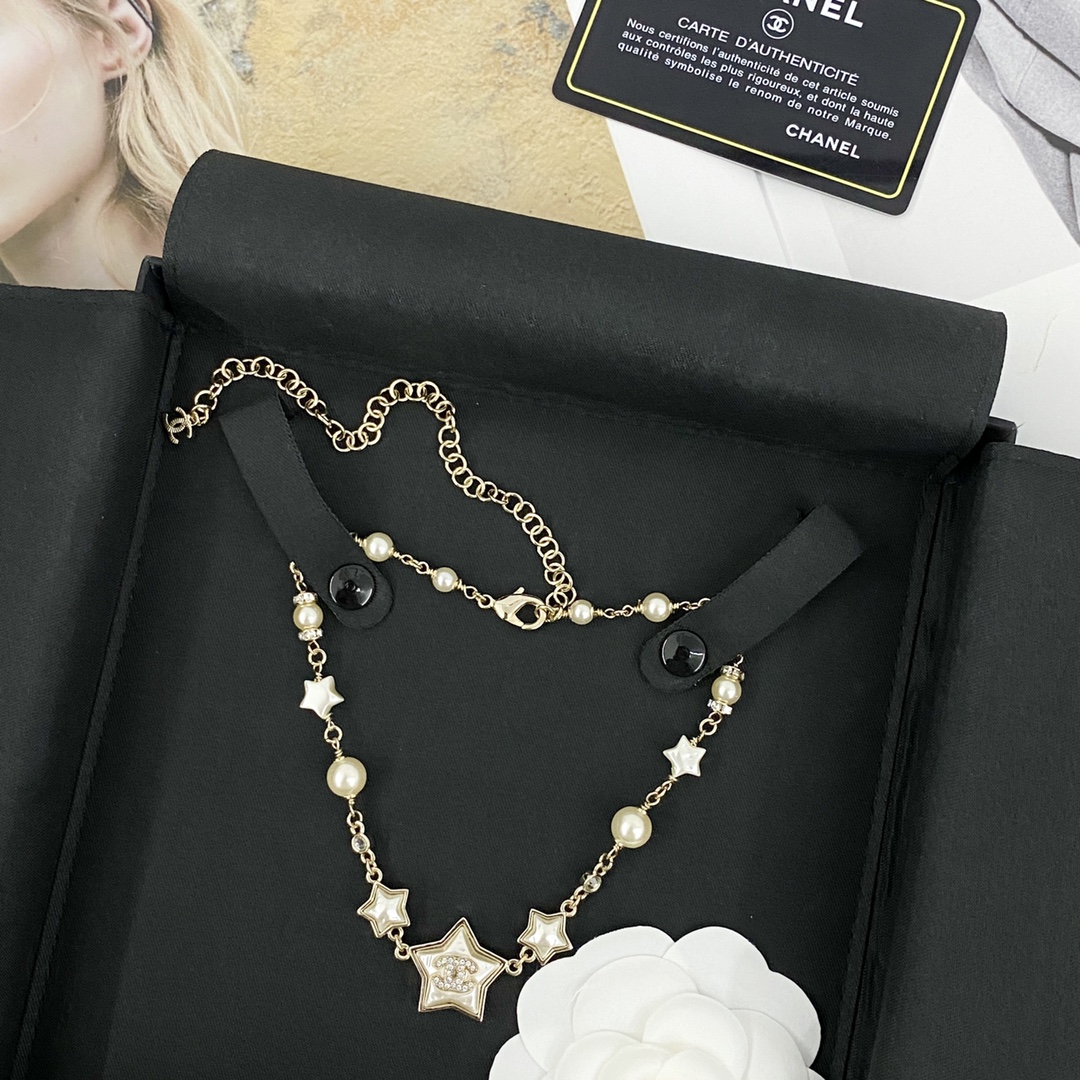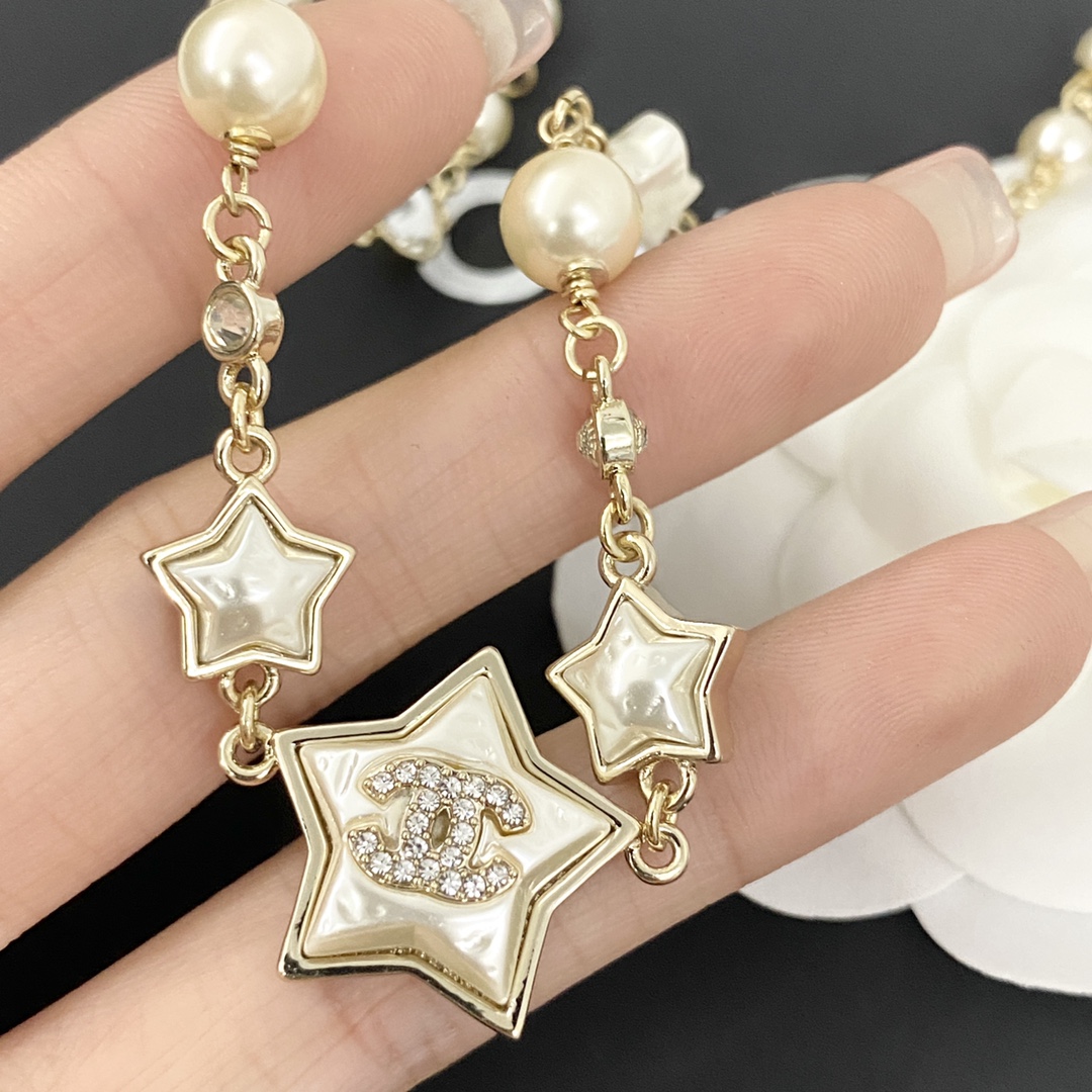 Detail😎Chanel Mother-of-Pearl Star Necklace🤒The combination of stars, double Cs, and pearls is both beautiful and luxurious, yet playful and adorable.🤑The white mother-of-pearl has an exquisite texture, is incredibly gentle and beautiful, and so sweet!