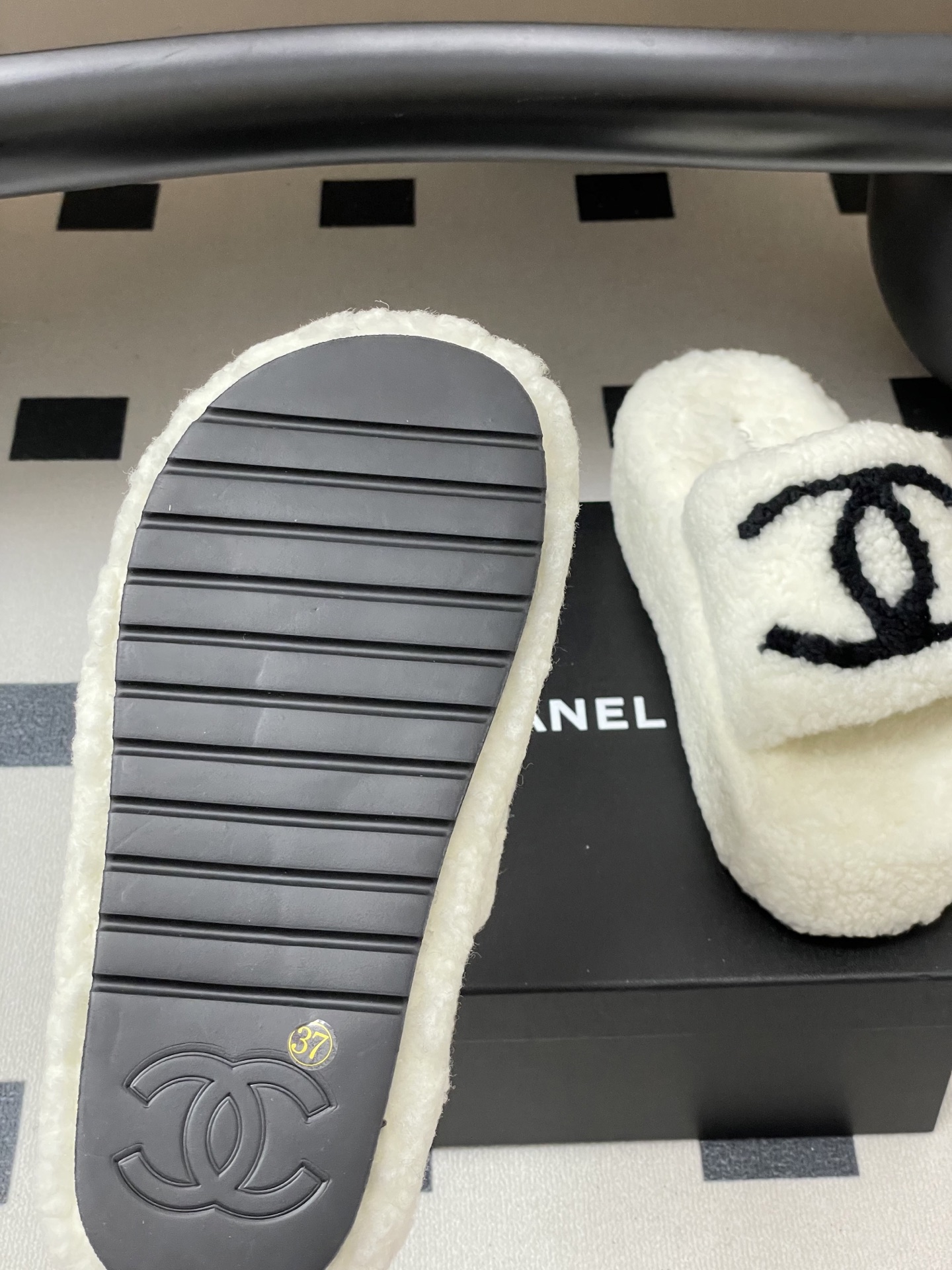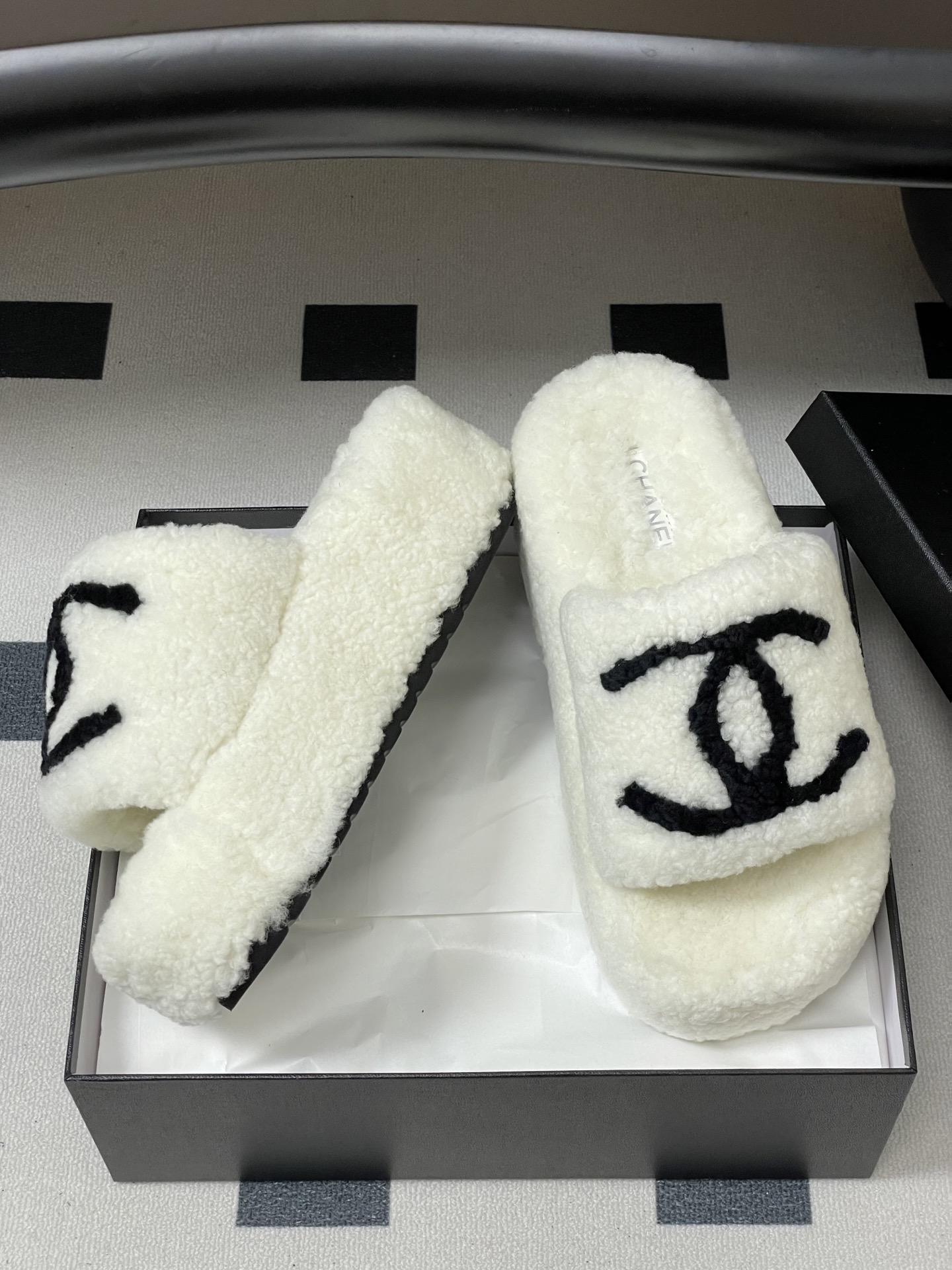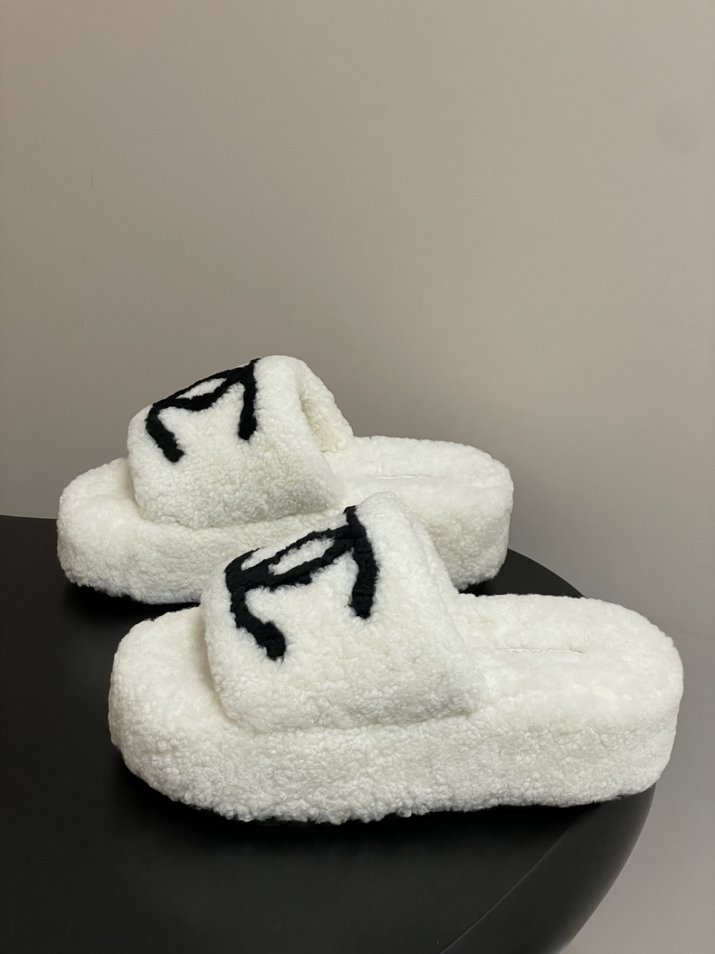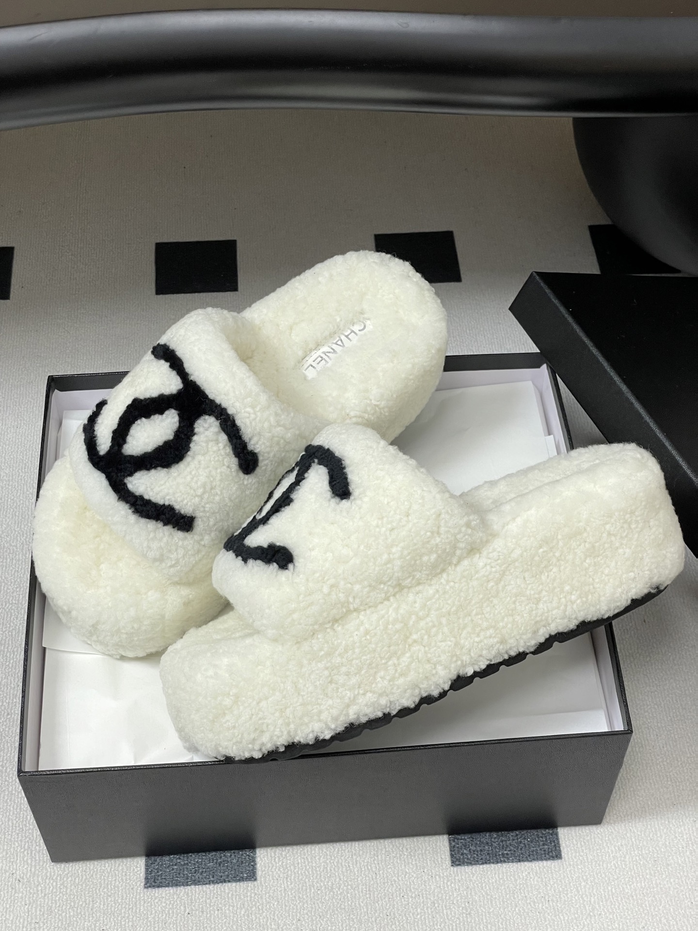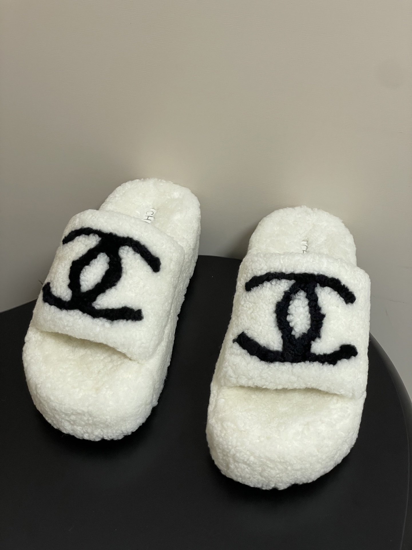 DetailNew fall/winter Chanel classic Double C wool slippers. Crafted with electric embroidery, the shoes are incredibly plush and comfortable, and the feel is simply irresistible! They're a winter staple!Upper: WoolInner lining: WoolSole: Original rubber outsole