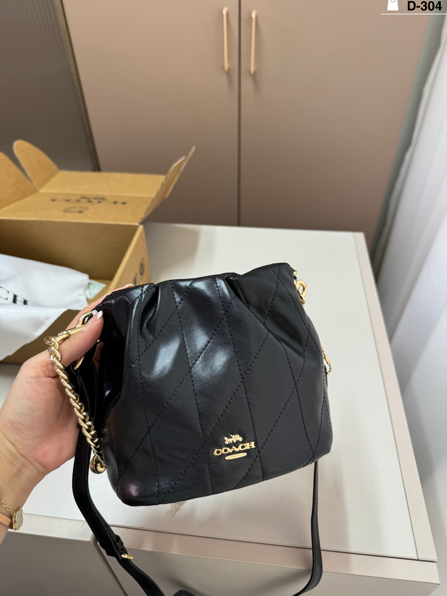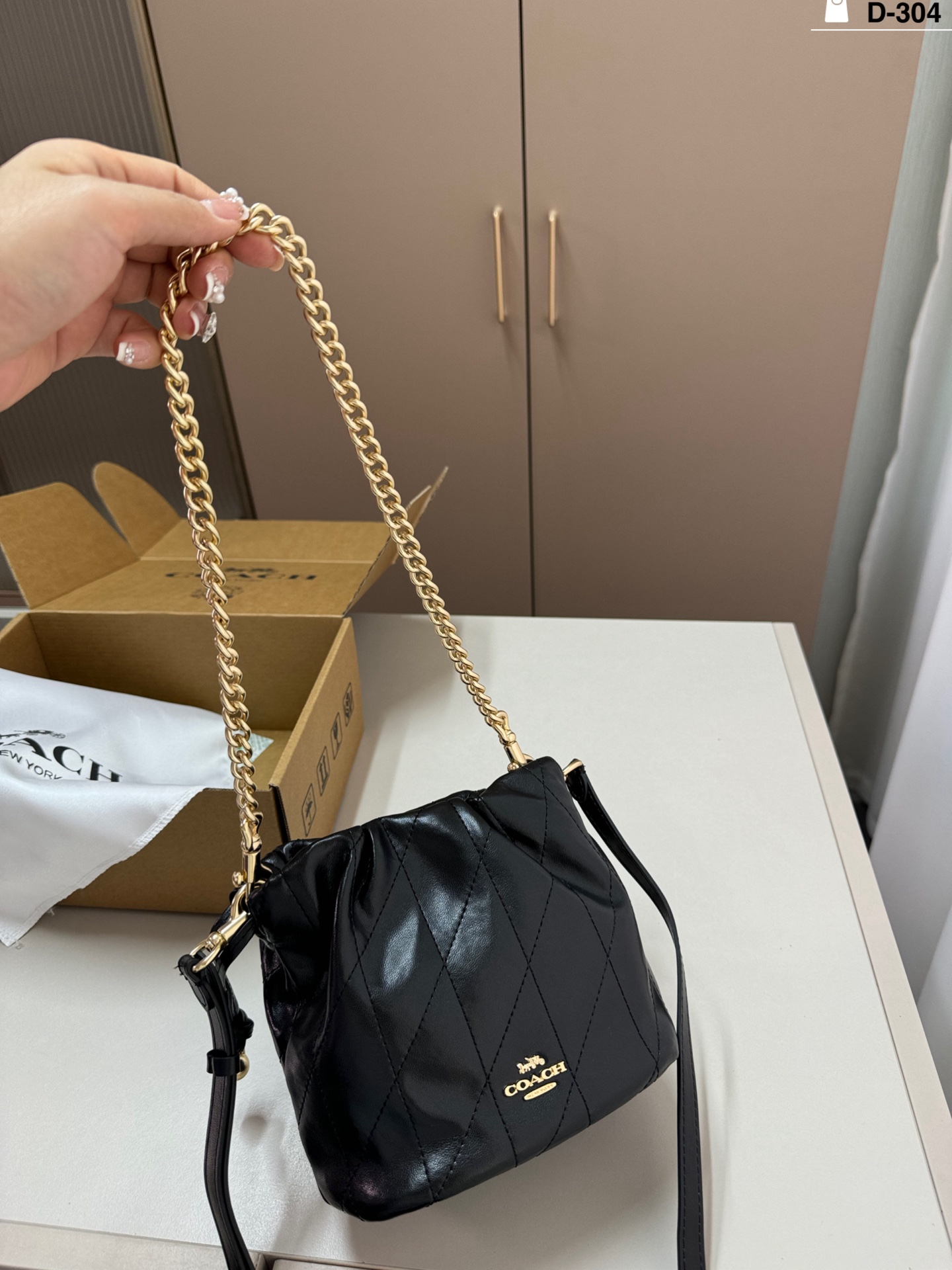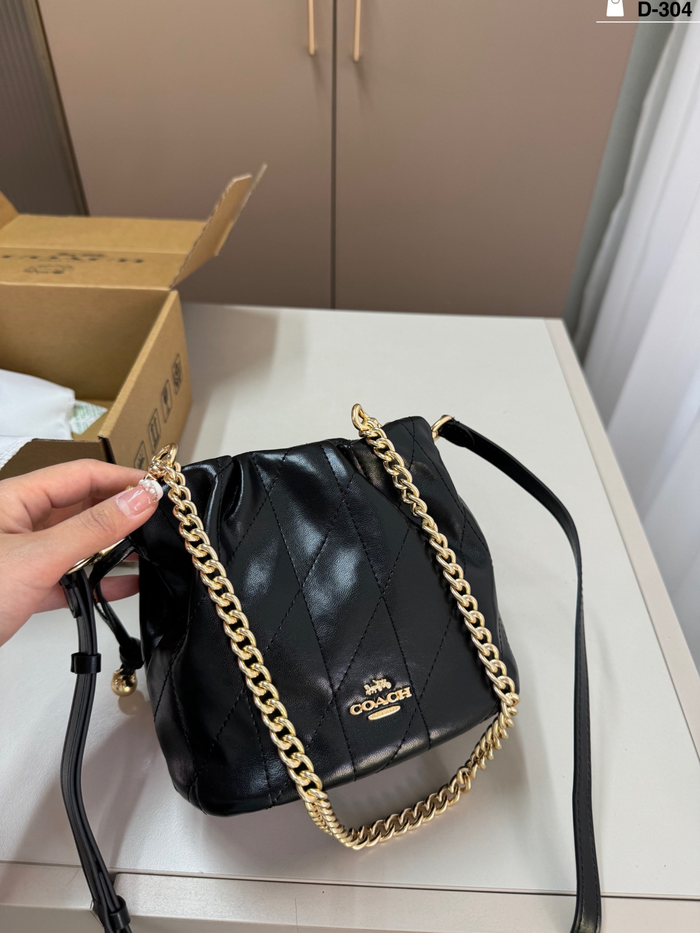 DetailThe Coach Faye mini drawstring bucket bag is simple, elegant, and versatile! The drawstring design is super flexible, and the chain is adjustable. It can be carried by hand, over the shoulder, or crossbody, making it suitable for both commuting and leisure.
