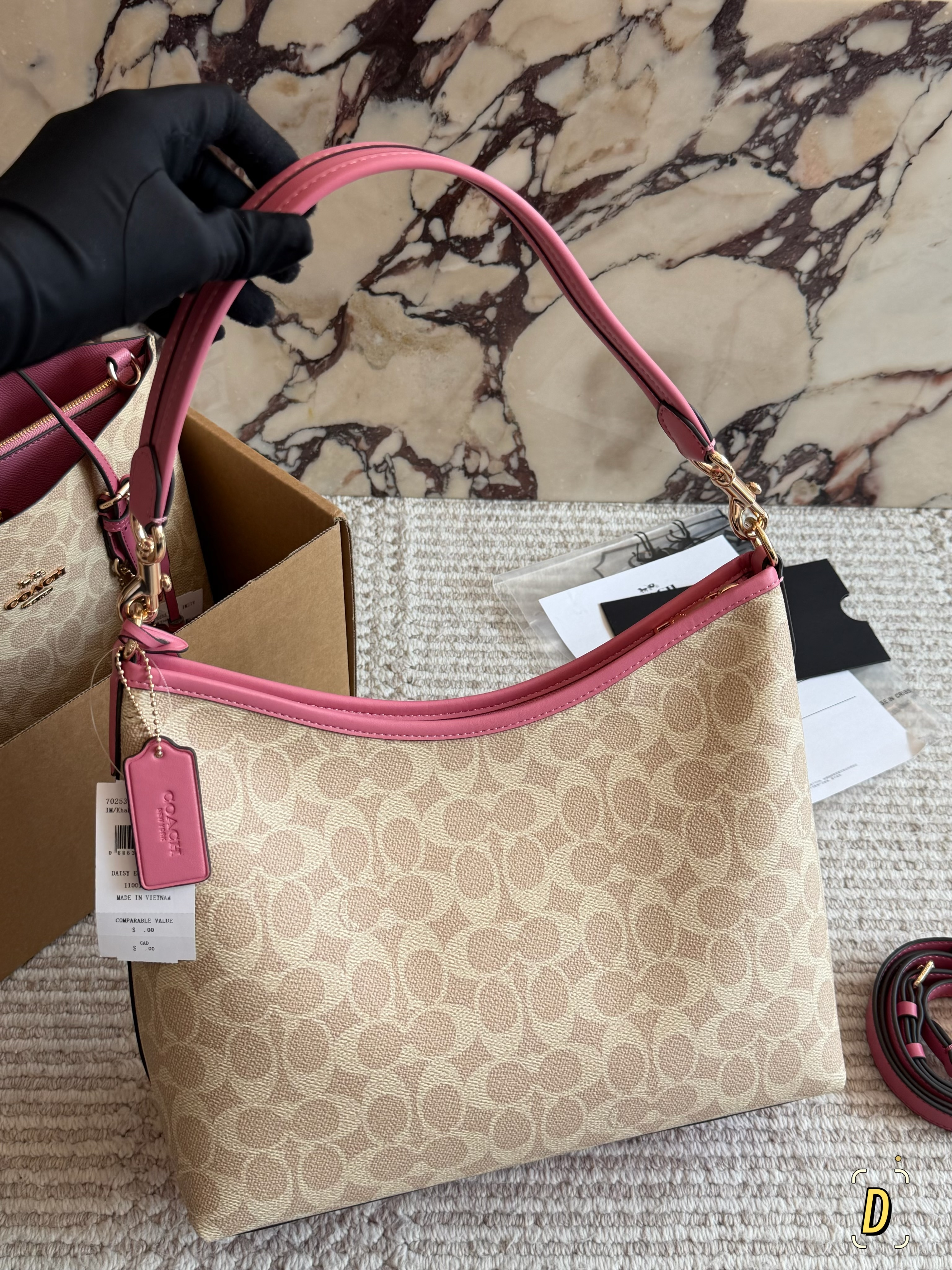 Detail🌸COACH Laurel hobo bag, featuring classic monogram canvas with pink leather trim, exuding a gentle and youthful charm! With a spacious 31cm capacity, it can easily hold a phone, tablet, and thermos, making it perfect for commuting and everyday use. The shoulder strap's curve conforms to the shoulder line, ensuring comfort even after extended wear.