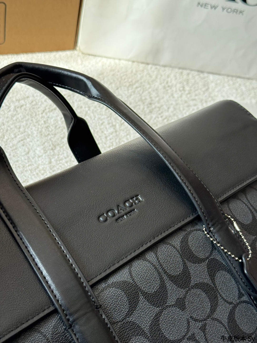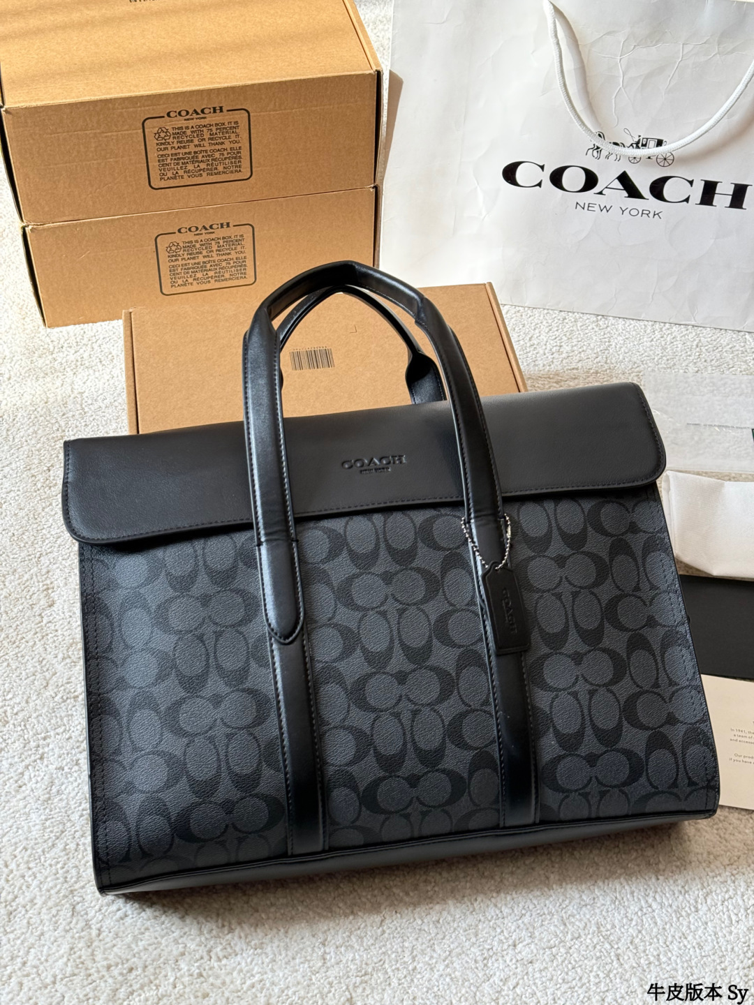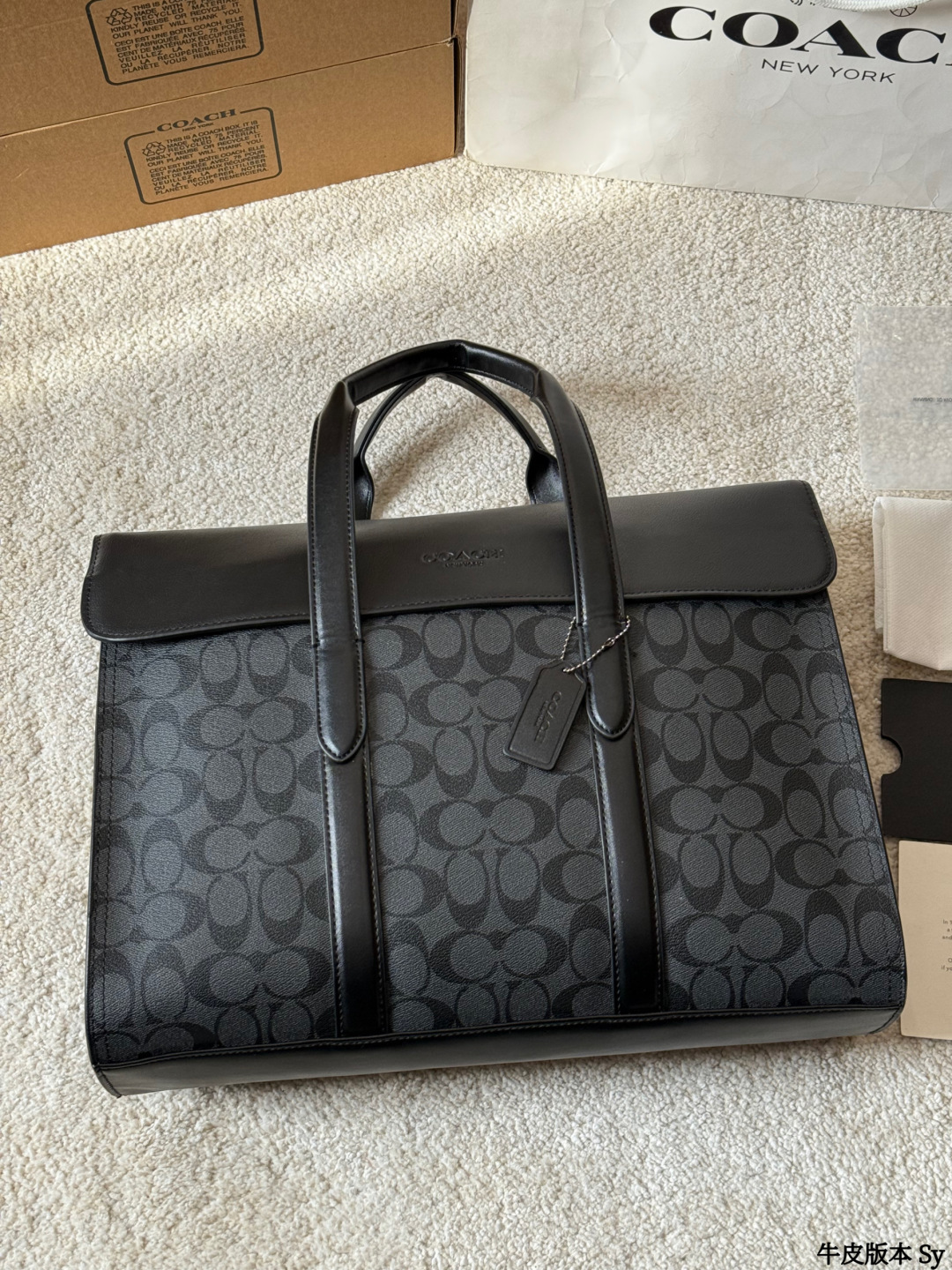The COACH Sullivan men's briefcase features a classic charcoal grey monogram print and black pebbled leather, exuding a simple yet sophisticated style suitable for both business and casual occasions. Measuring approximately 39x28x9.5cm, it boasts an interior with a laptop compartment, multiple pockets, and a security clasp for convenient organization. The detachable shoulder strap allows for easy hand-carrying, shoulder-carrying, or crossbody wear, making it practical for commuting and business trips. The understated monogram logo adds a touch of sophistication, making it both practical and stylish—an ideal choice for business professionals.