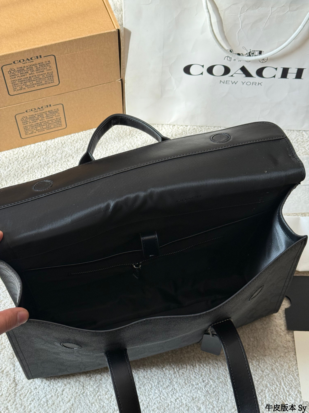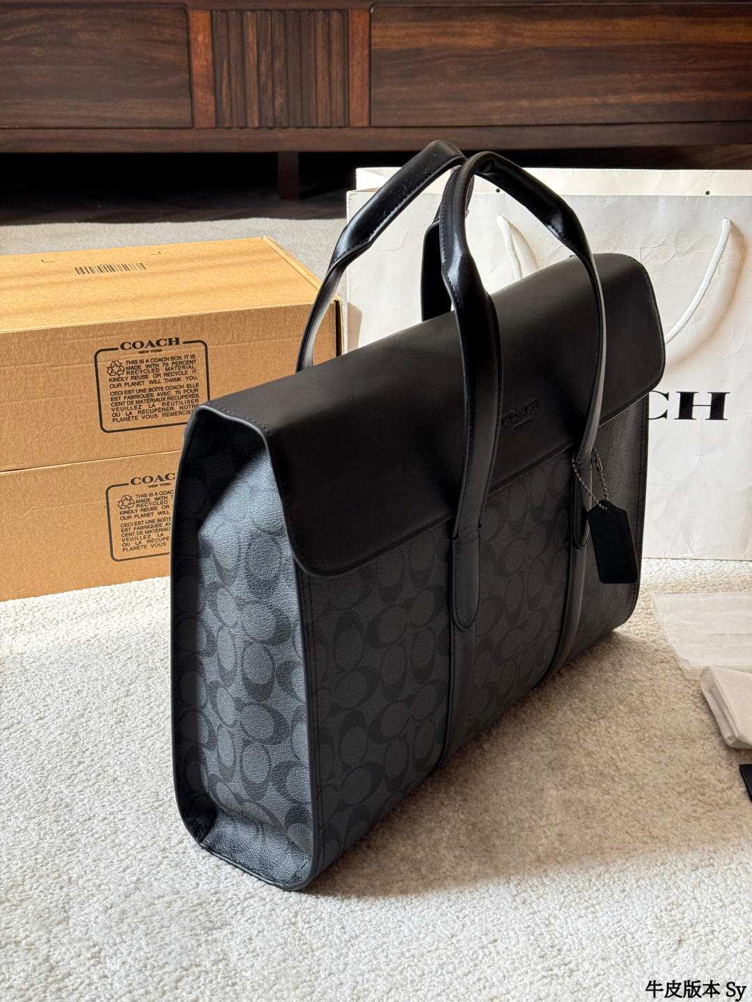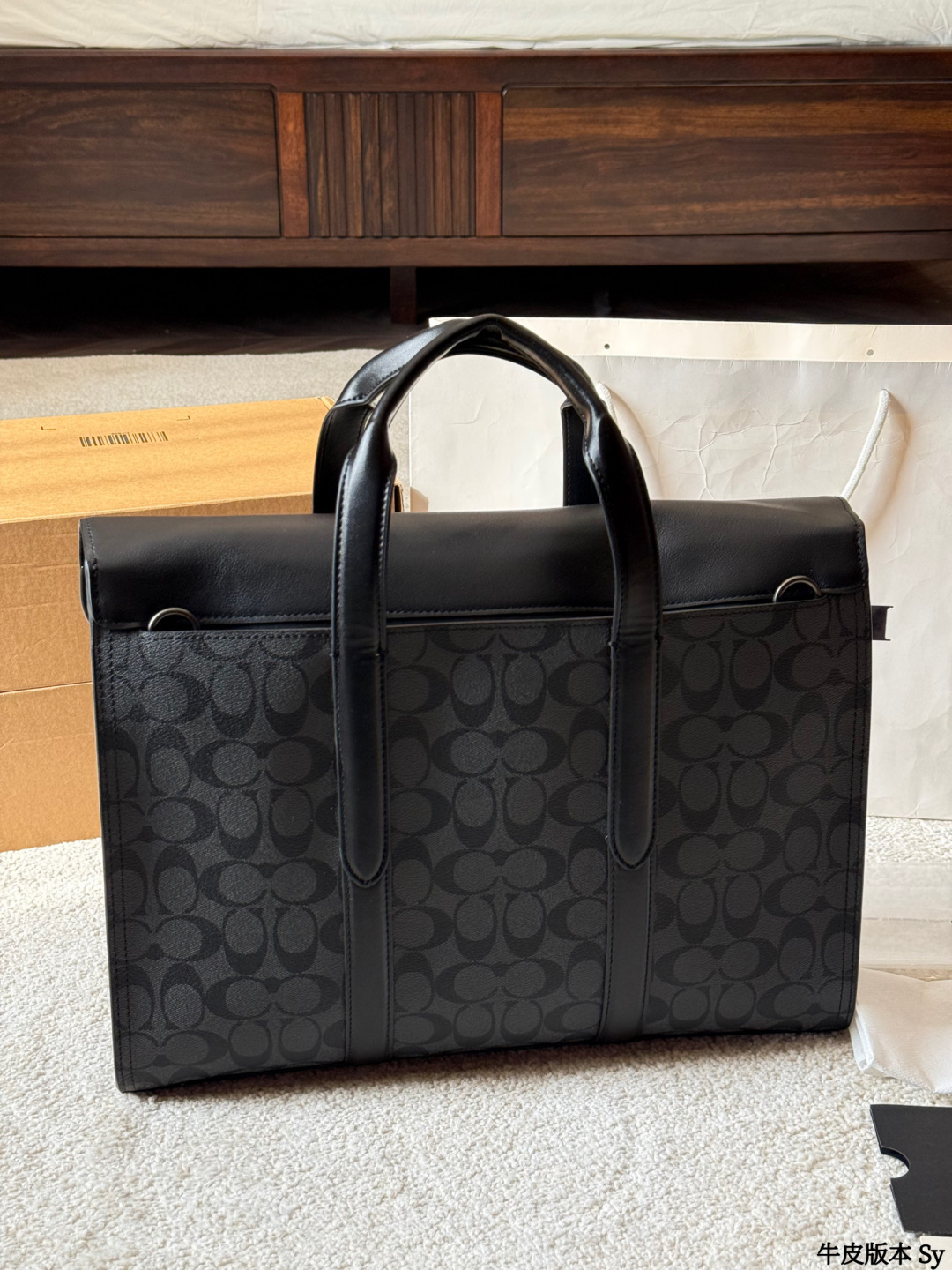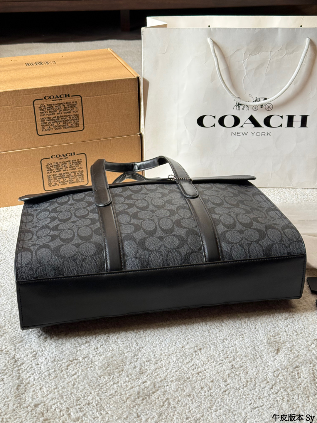The COACH Sullivan men's briefcase features a classic charcoal grey monogram print and black pebbled leather, exuding a simple yet sophisticated style suitable for both business and casual occasions. Measuring approximately 39x28x9.5cm, it boasts an interior with a laptop compartment, multiple pockets, and a security clasp for convenient organization. The detachable shoulder strap allows for easy hand-carrying, shoulder-carrying, or crossbody wear, making it practical for commuting and business trips. The understated monogram logo adds a touch of sophistication, making it both practical and stylish—an ideal choice for business professionals.