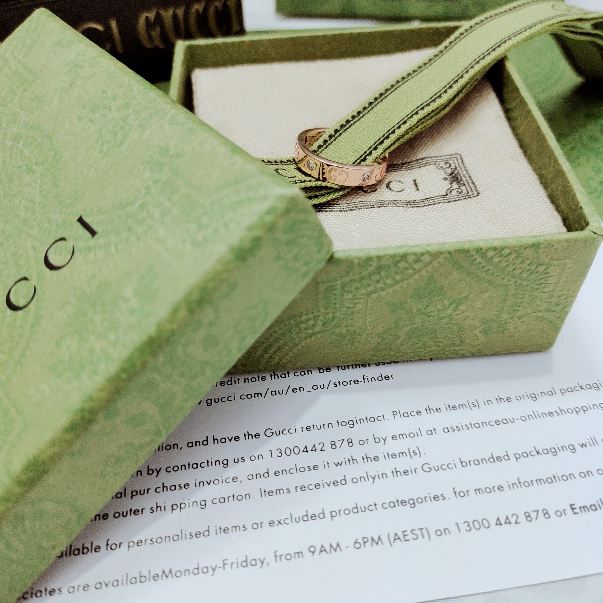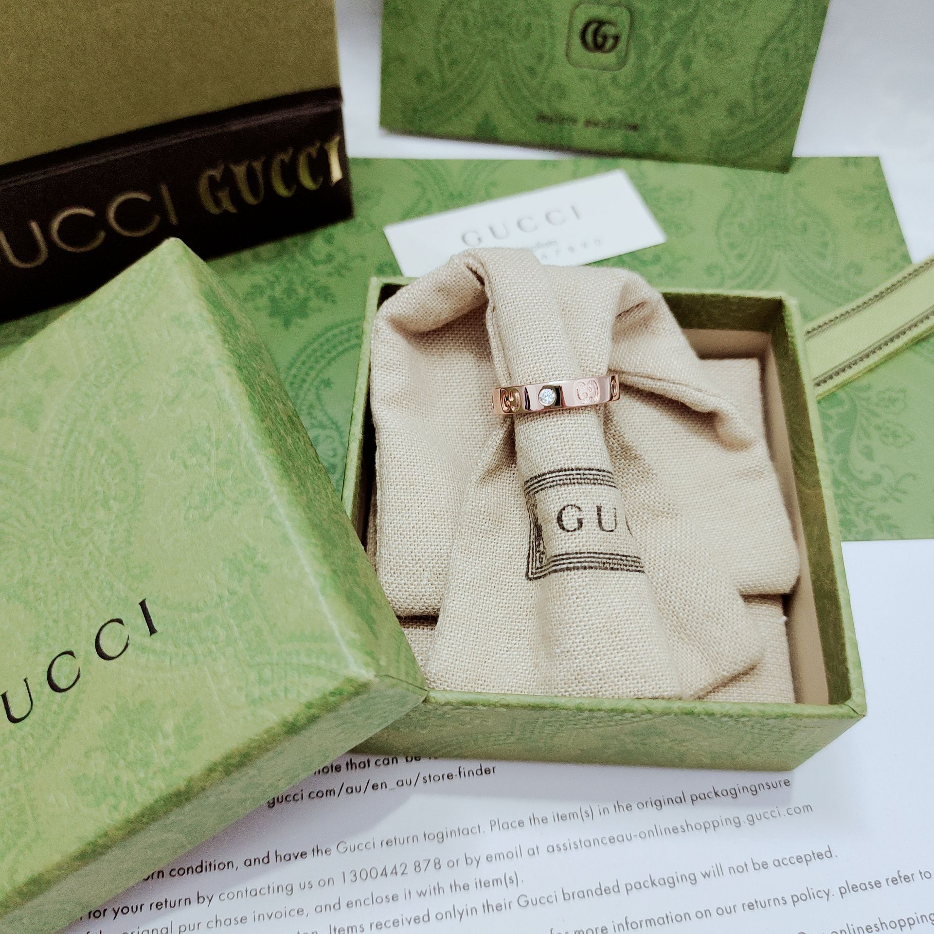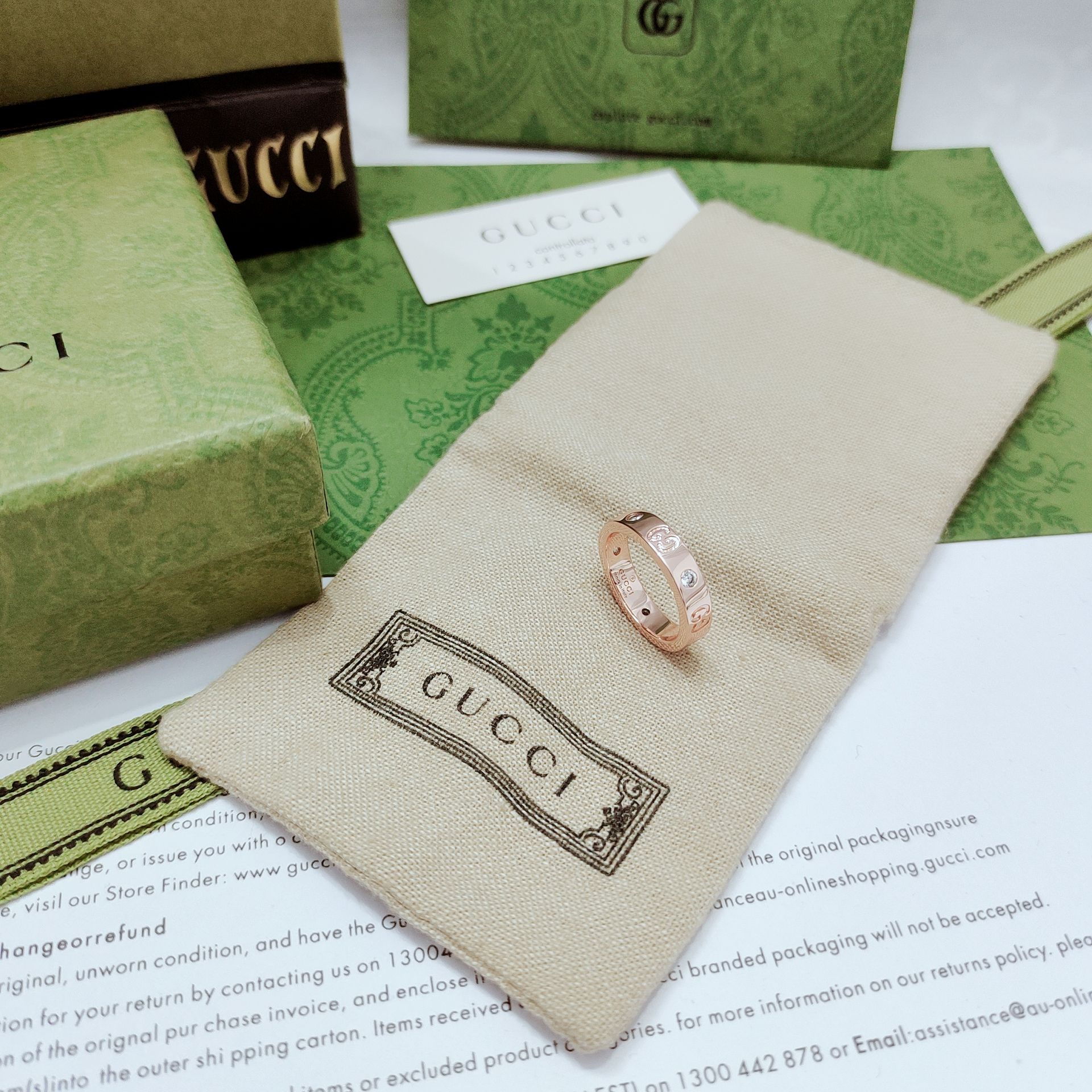 DetailThis ring cleverly incorporates the brand's double G letter interwoven pattern, engraving the LOGO letters as a pattern on the narrow ring of the jewelry and setting diamonds in the middle. The new series continues the classic logo GG pattern.