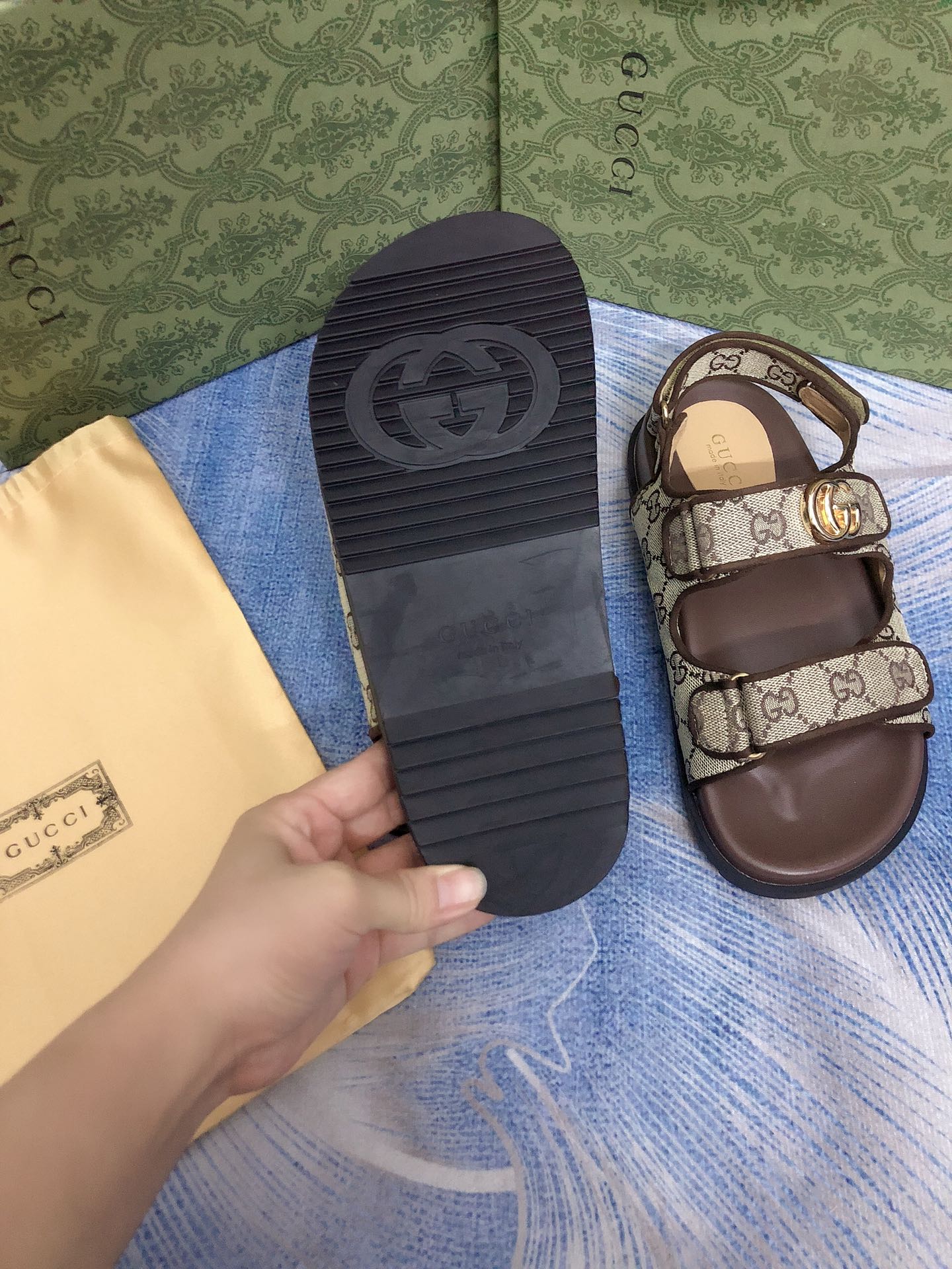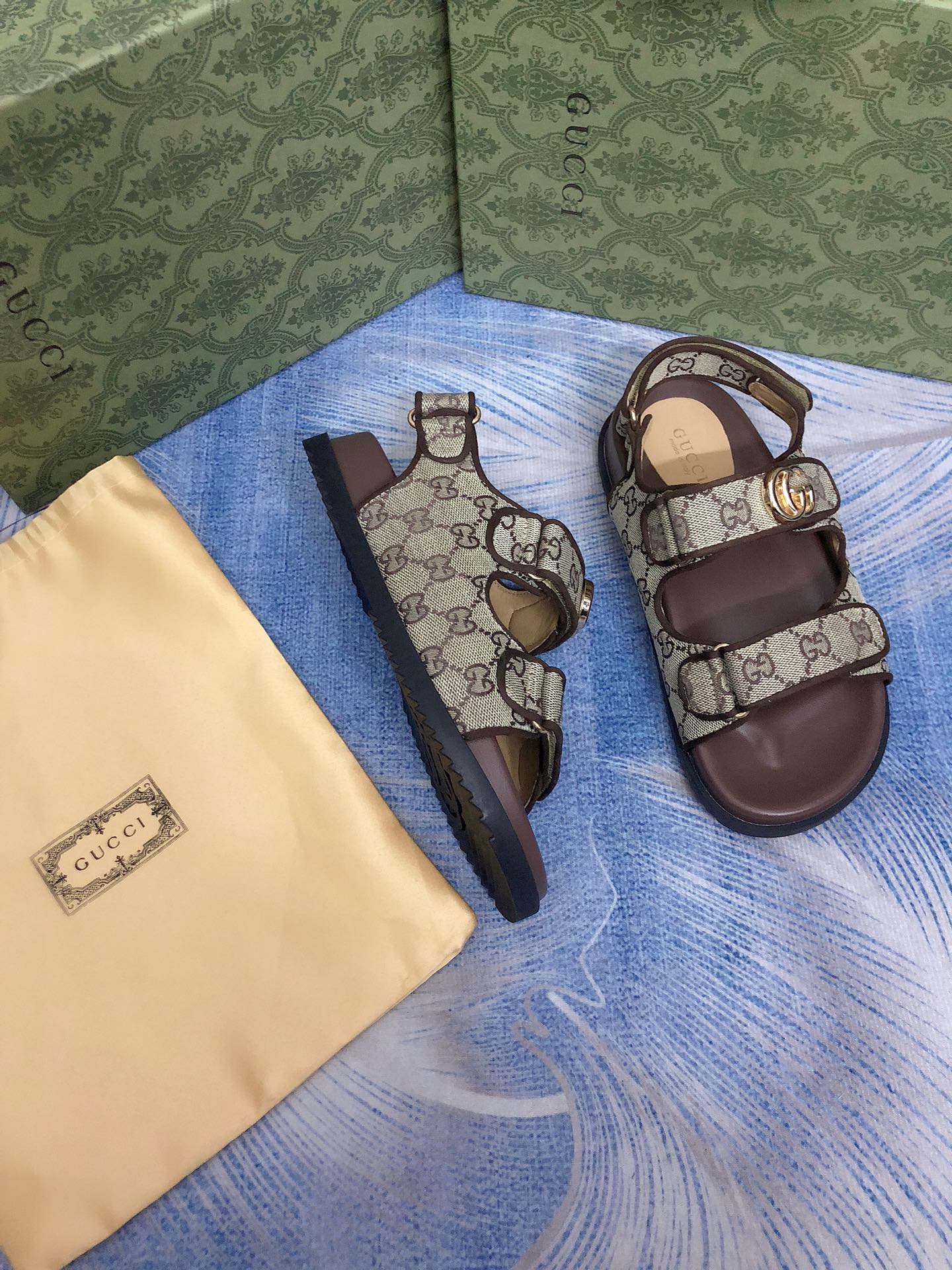 These sandals feature classic details such as a GG-print embossed outsole, interlocking double Gs, and "Gucci" embroidery, adding to their charm and style.