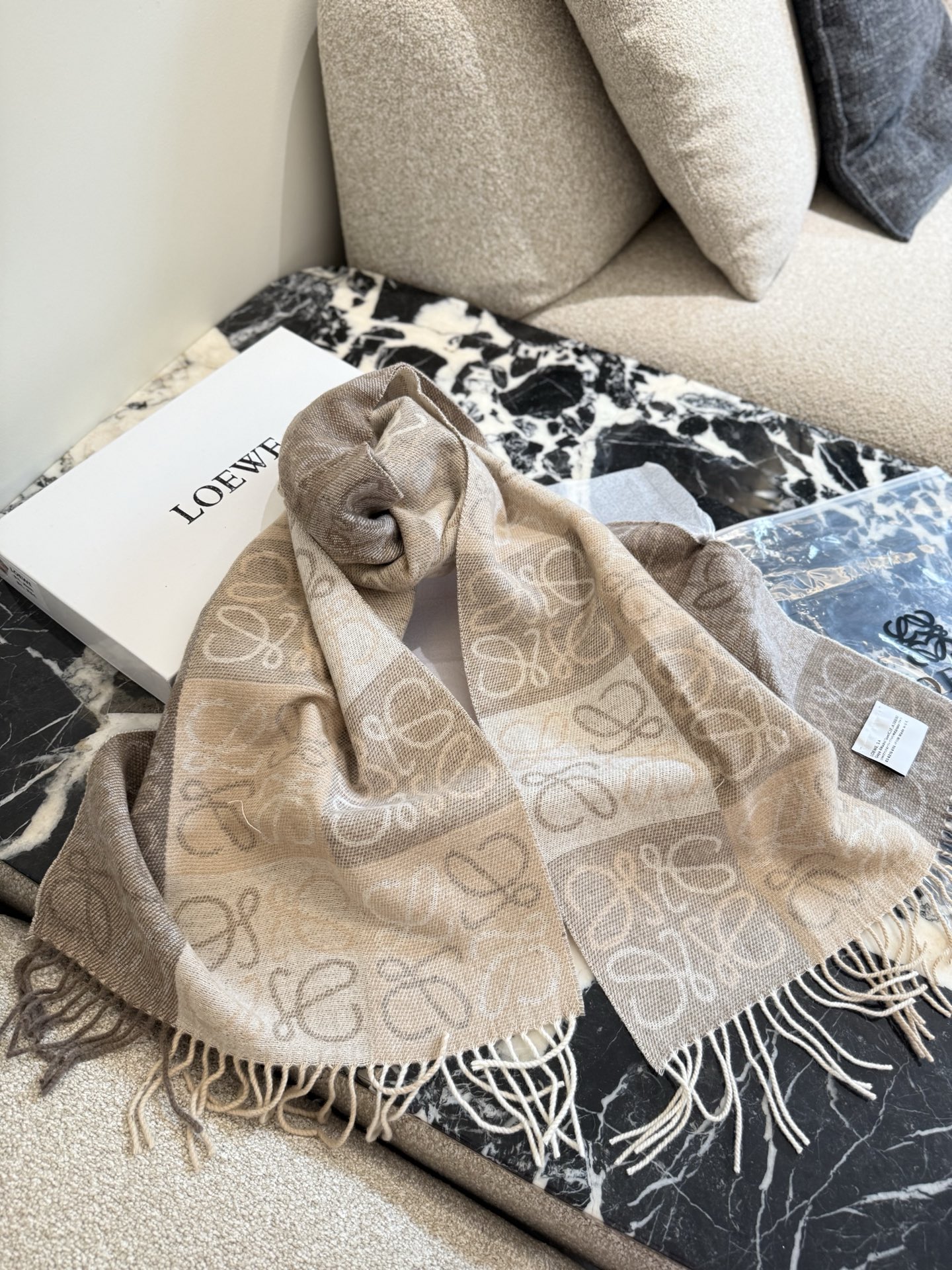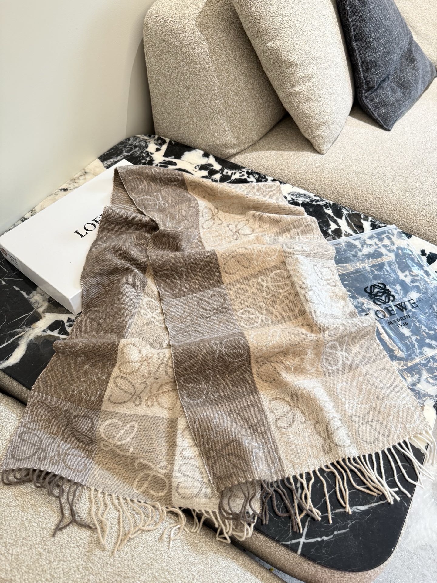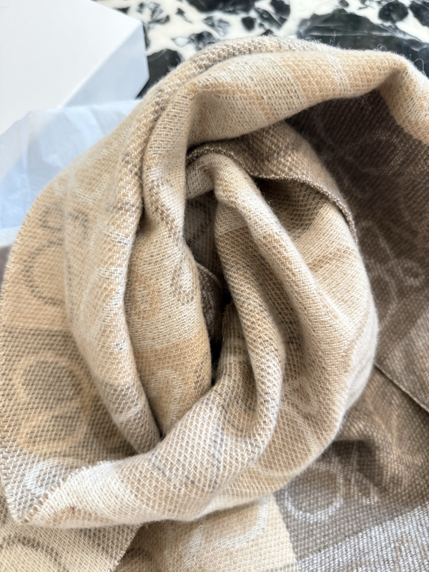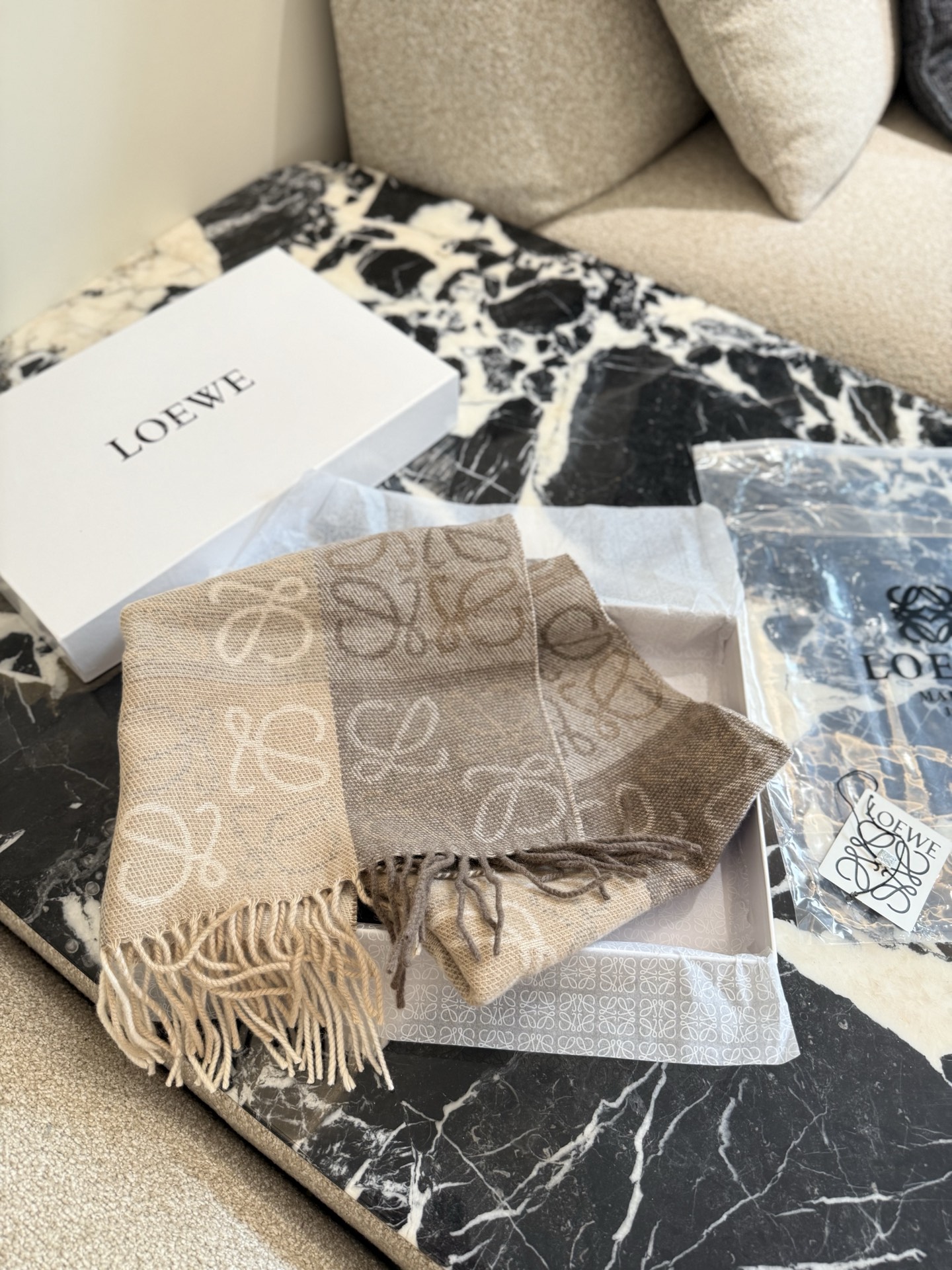 DetailLoewe's stylish and versatile scarf.This one is a 90% wool and 10% cashmere blend, so it's soft and comfortable.The milk tea color is really beautiful and pairs perfectly with a coat. It also looks great on its own.
