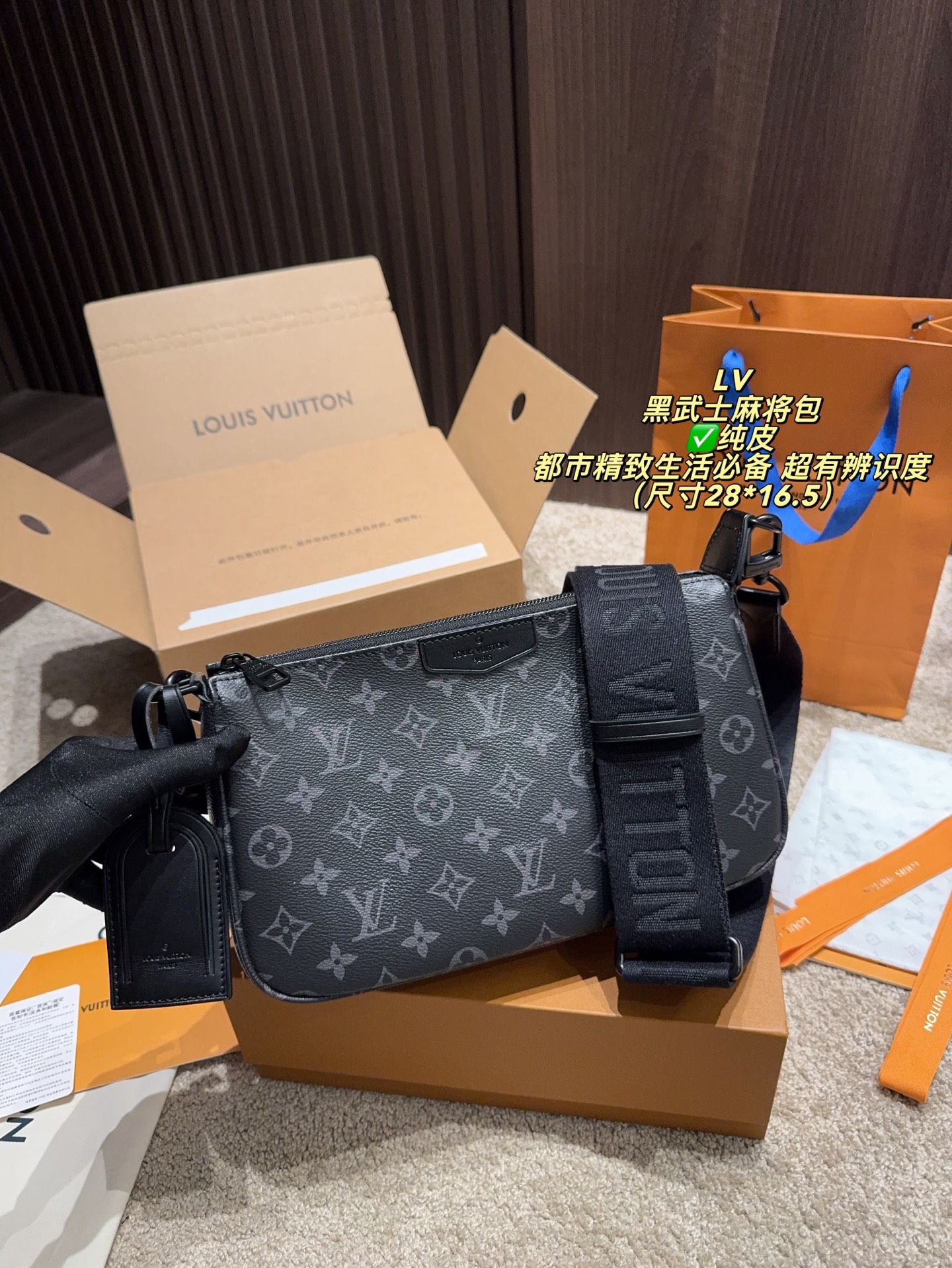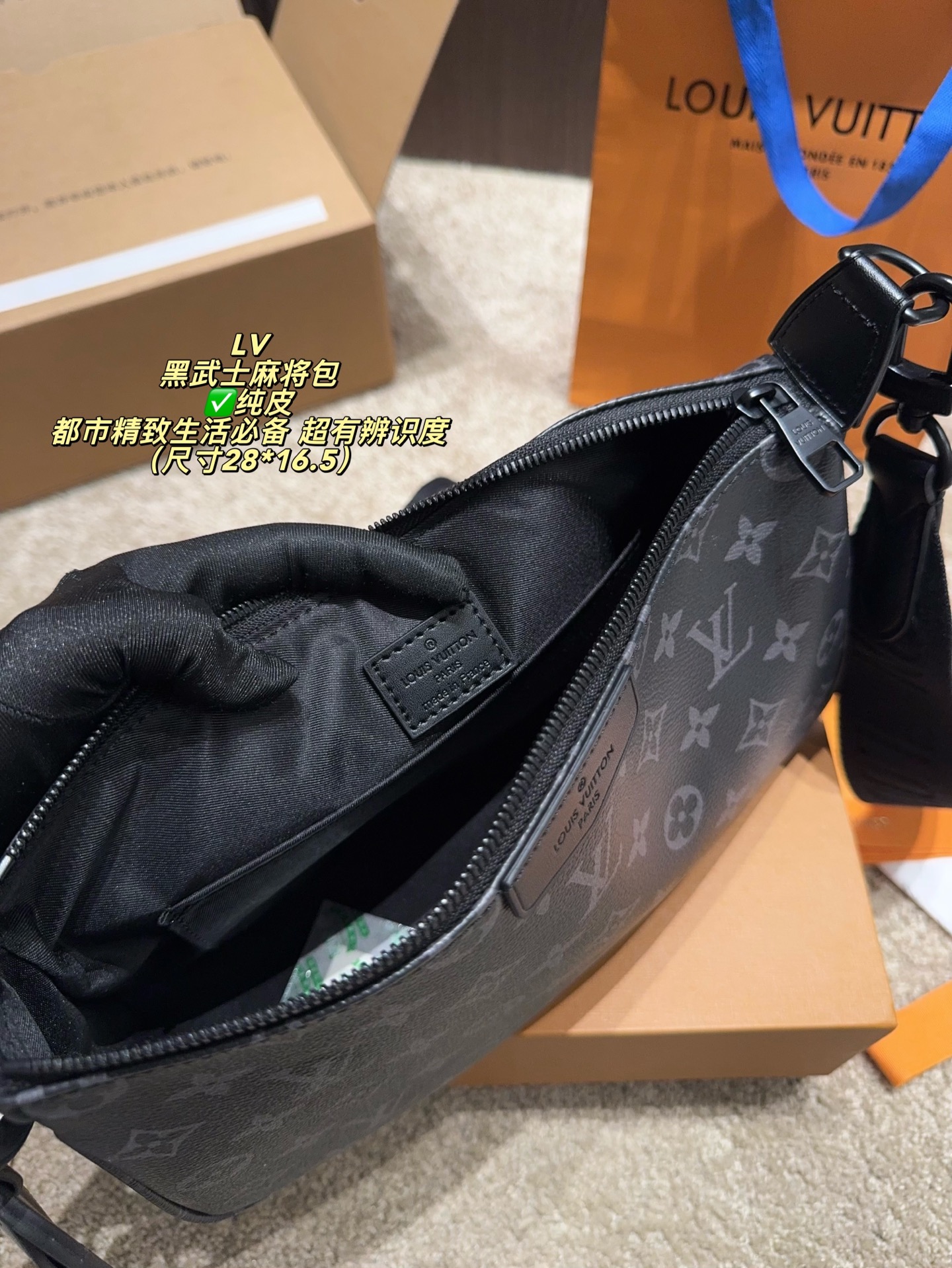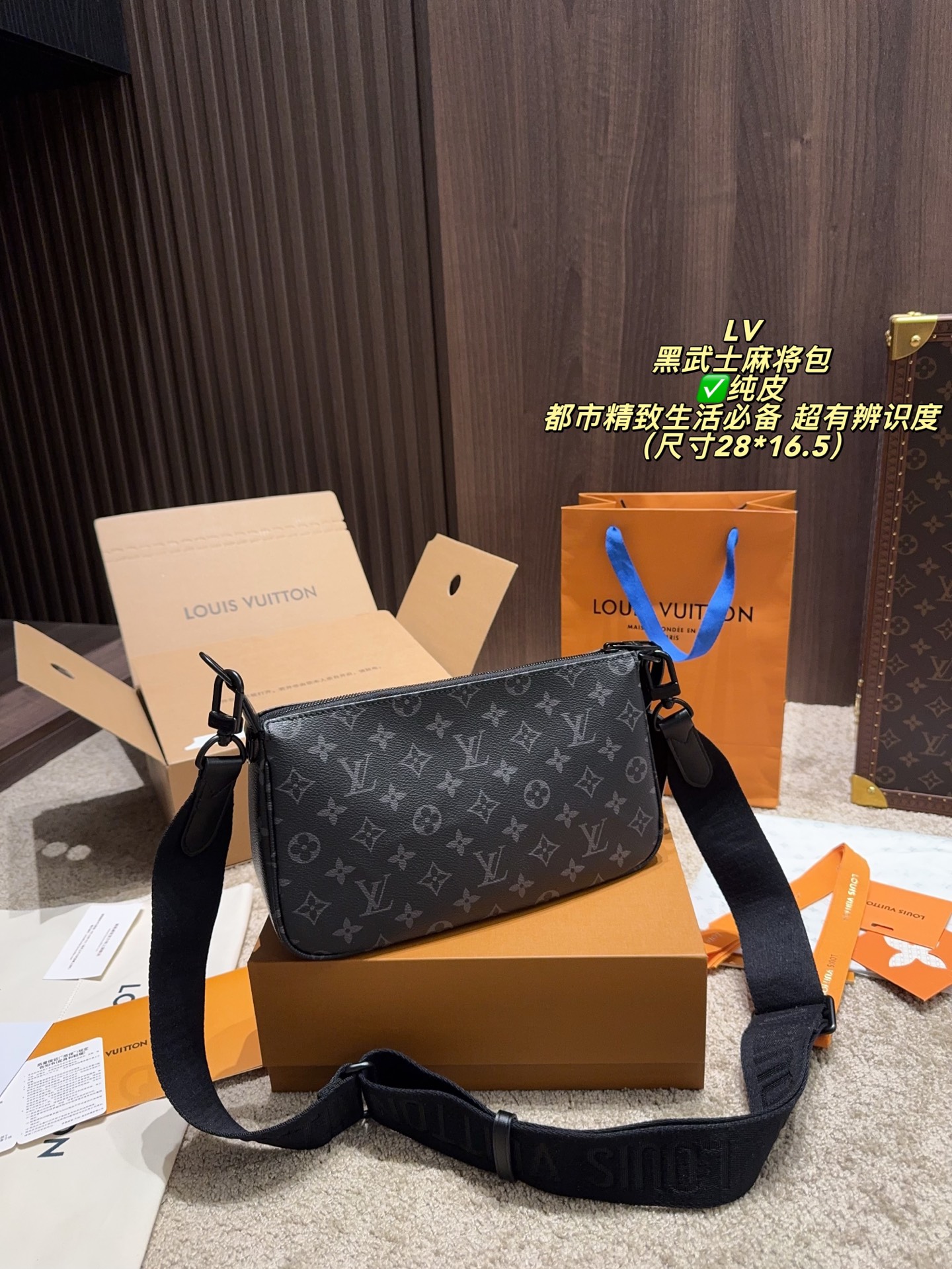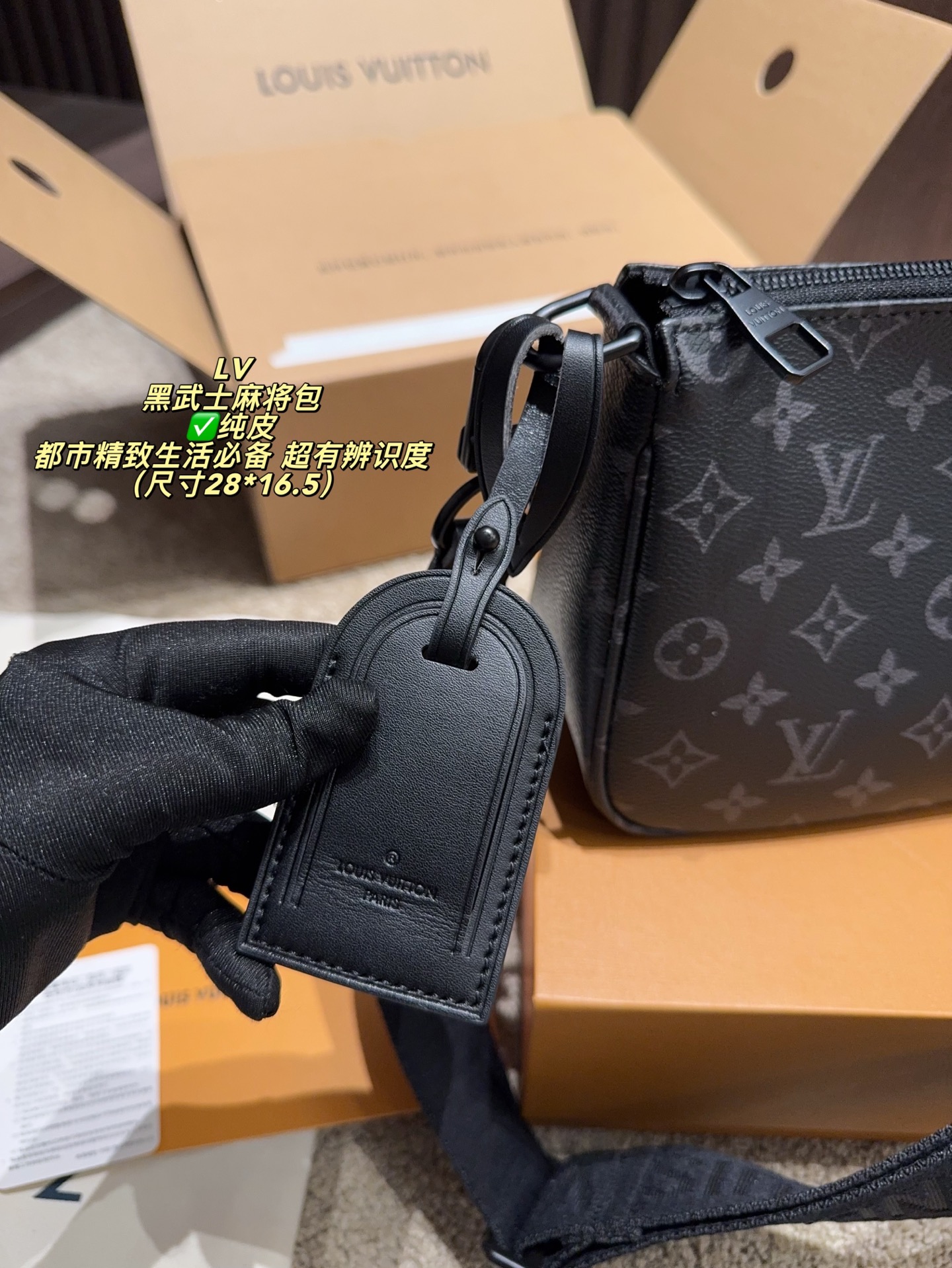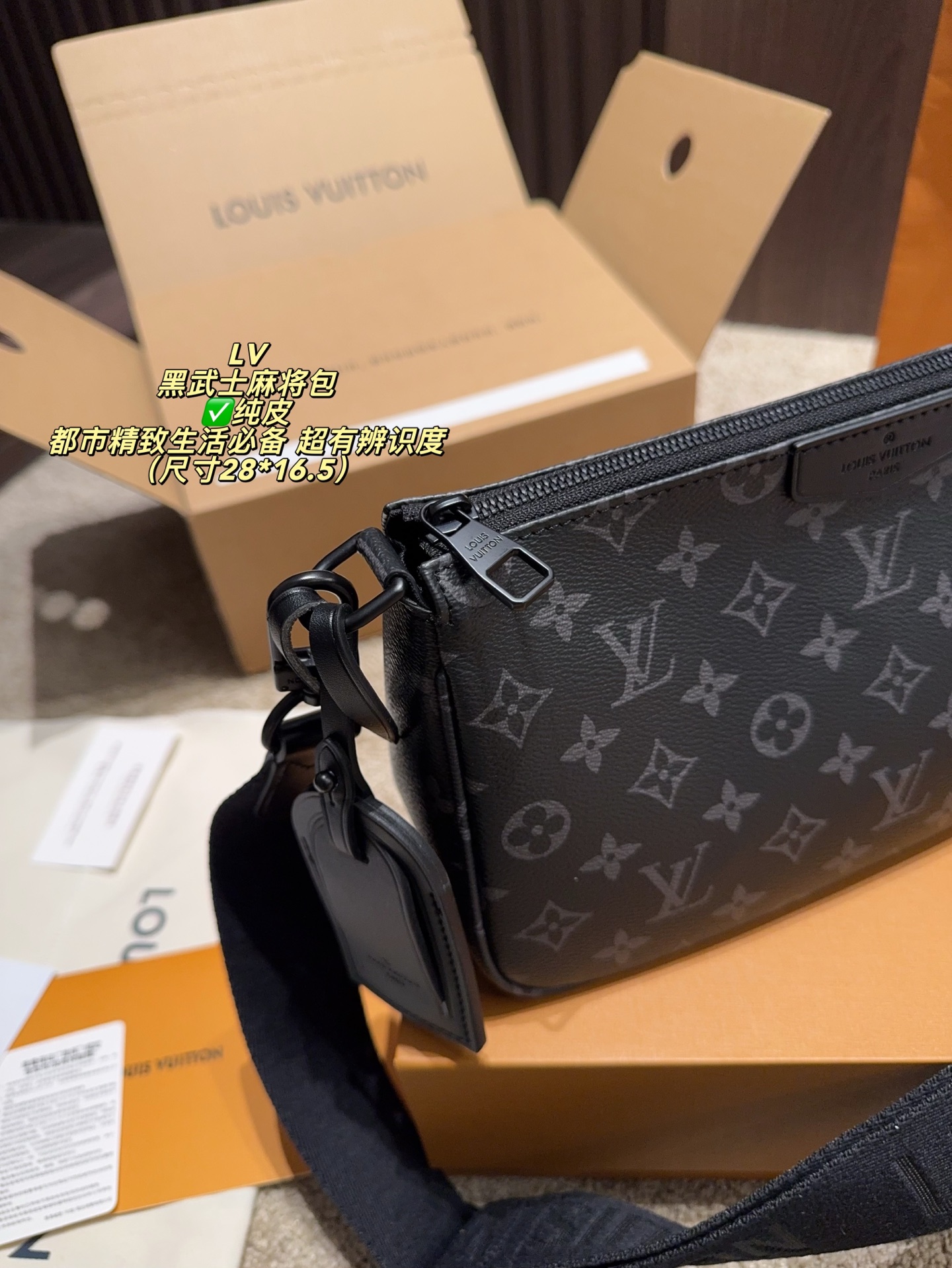 DetailThe LV Black Knight Mahjong Bag. Made with classic Damier Graphite canvas and black calfskin trim, it's understated yet highly recognizable. A comfortable size, it features a detachable wide shoulder strap with the Louis Vuitton logo. The well-designed interior space is suitable for both commuting and leisure, and the zipper closure ensures a secure and professional look. The durable and easy-care Damier Graphite canvas makes it an essential item for a sophisticated urban lifestyle.