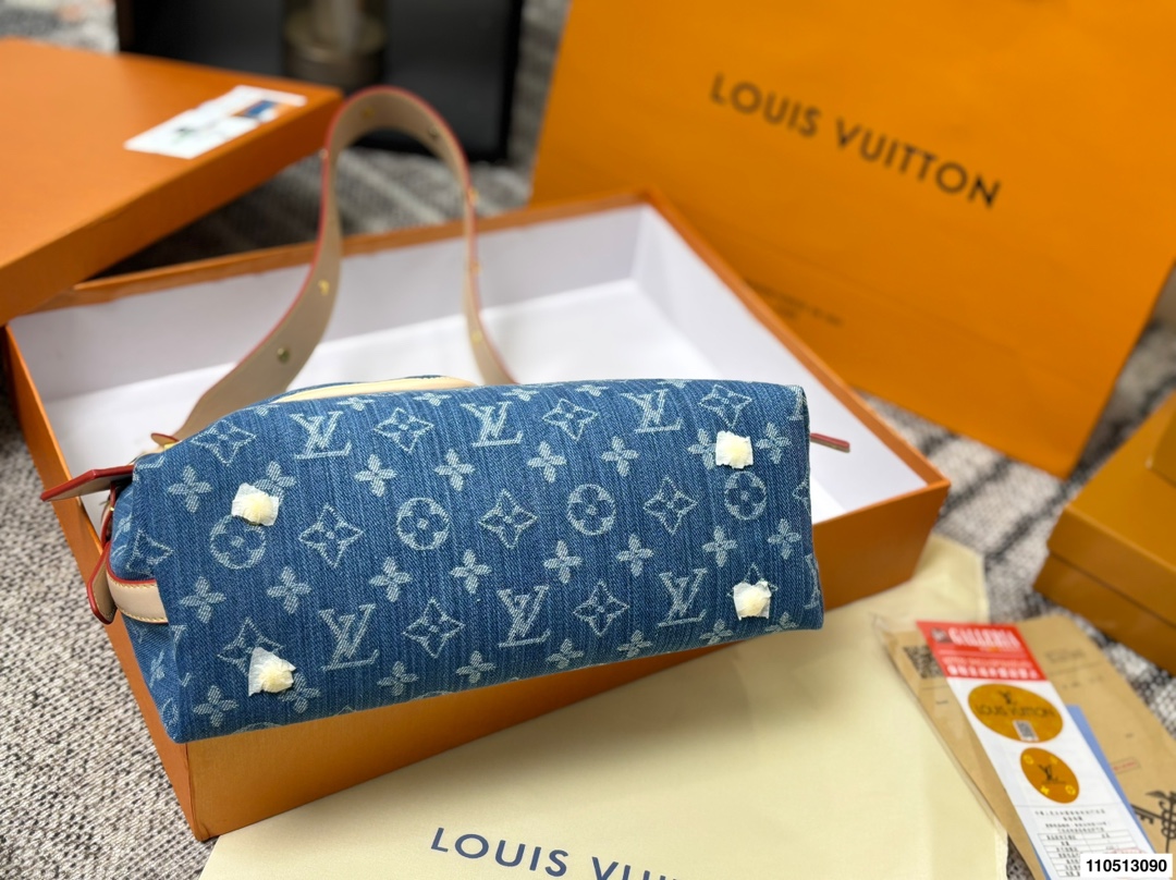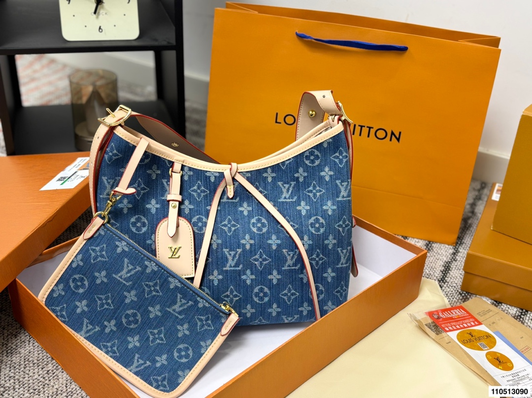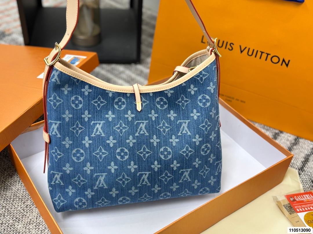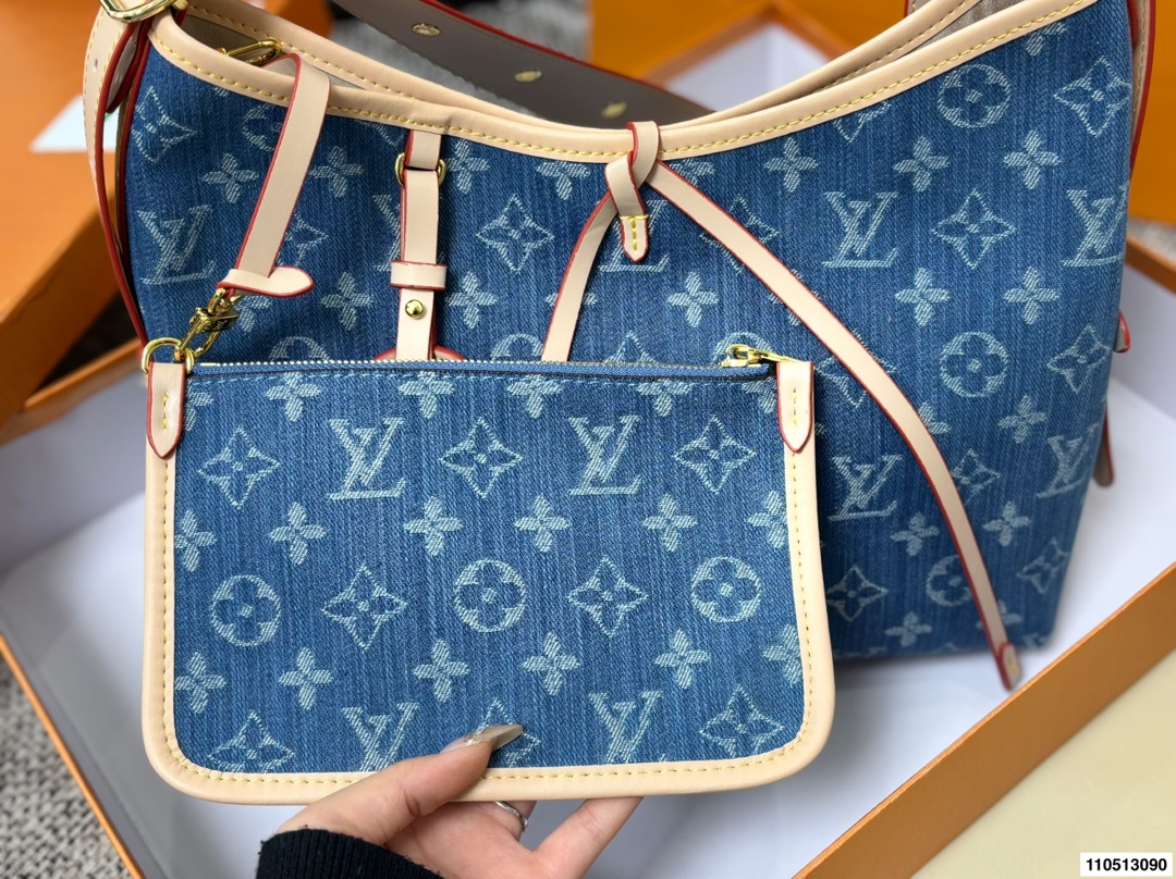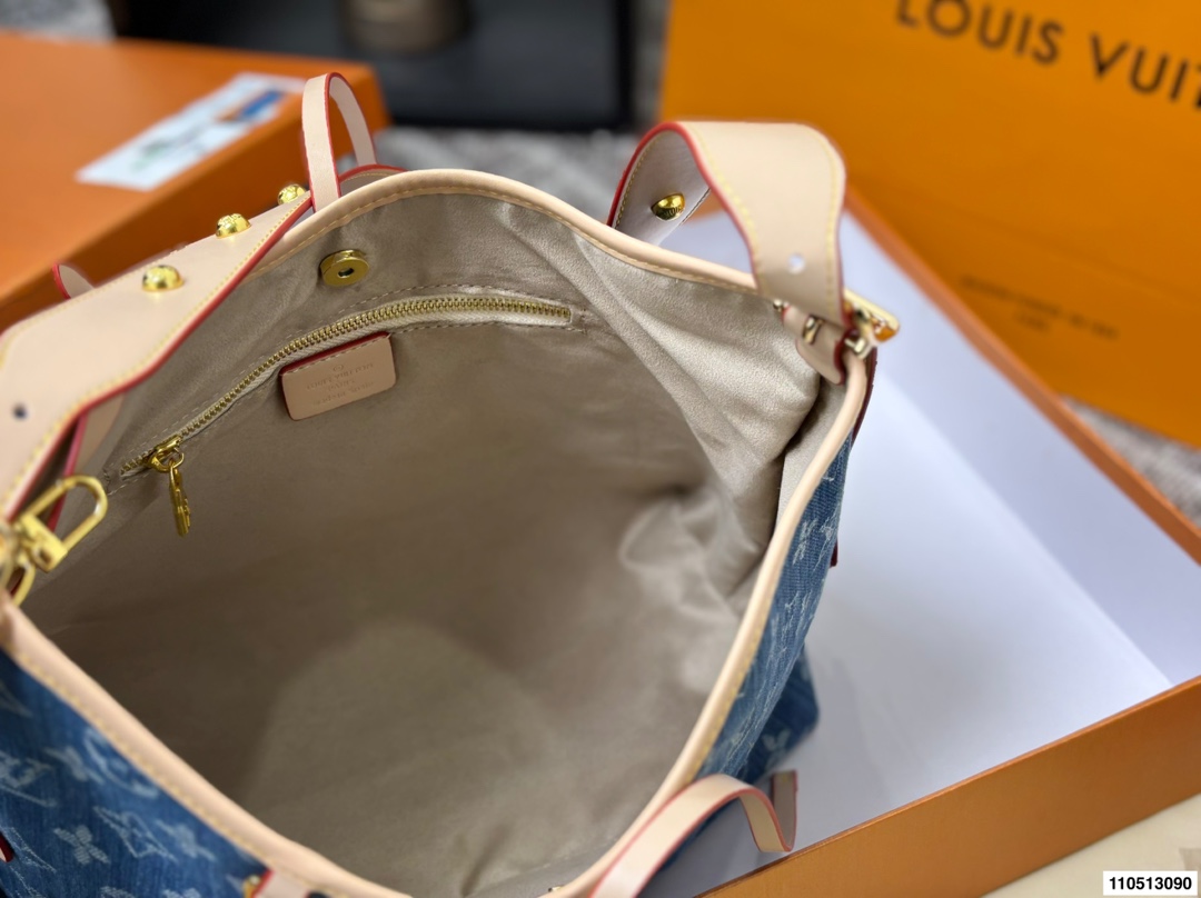 DetailLV Denim Carryall Bag 💕Features a casual yet spacious designEspecially suitable for commuting and air travelGuaranteed capacity, open top with magnetic closure and inner claspVery convenient for taking out and putting in tablets and small laptopsCan be worn crossbody or over the shoulder, effortlessly chic style!