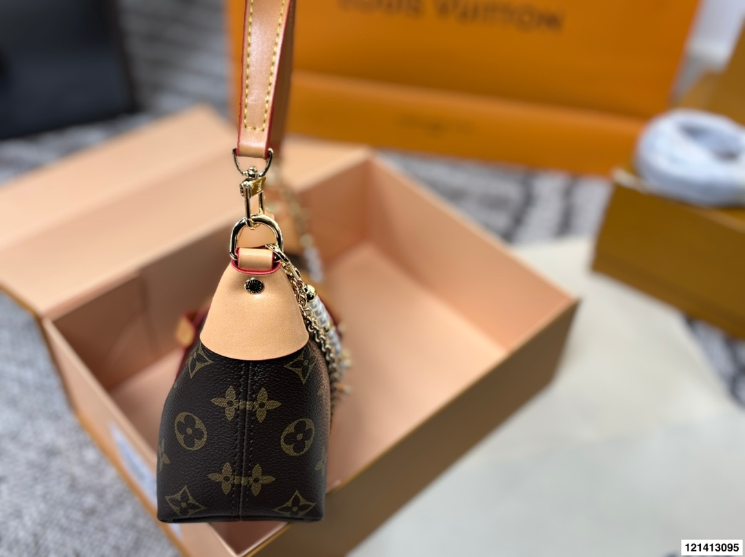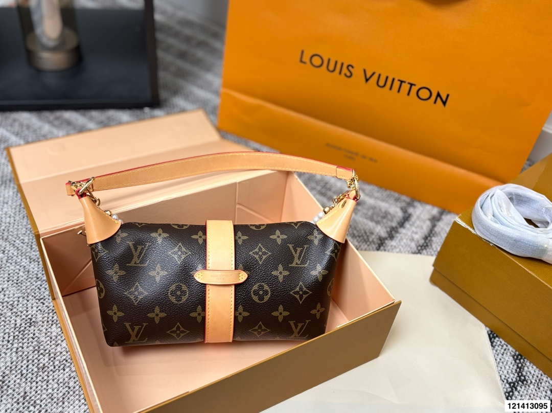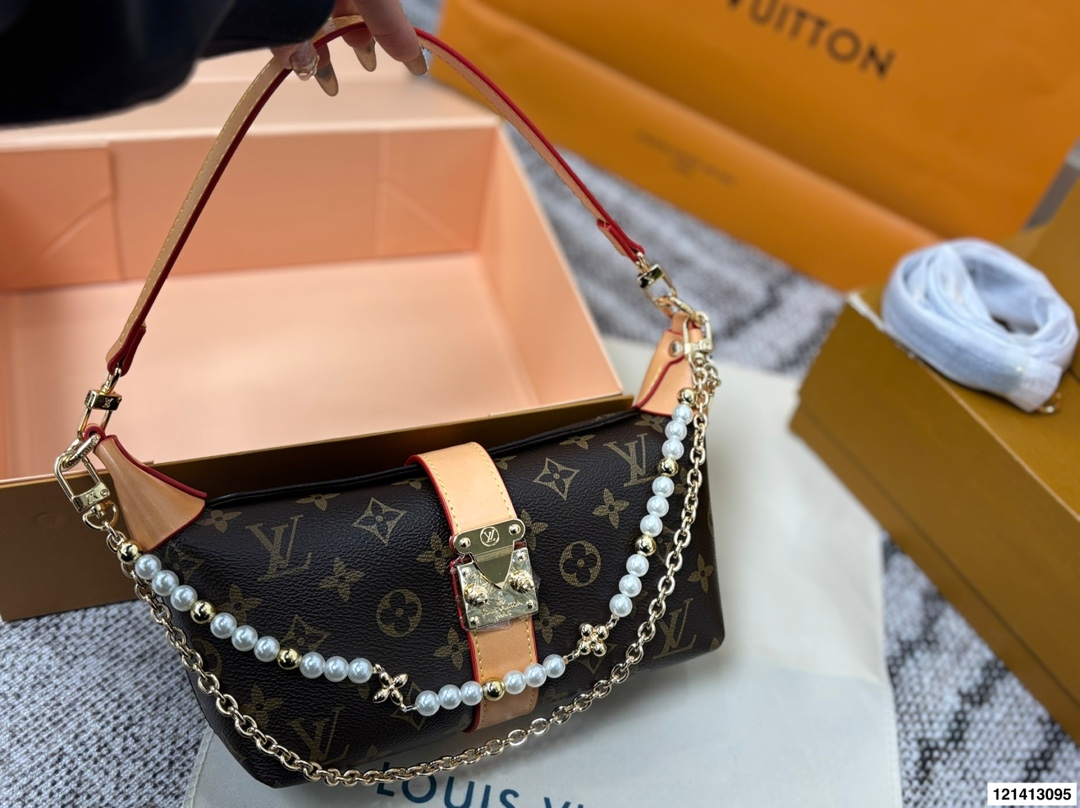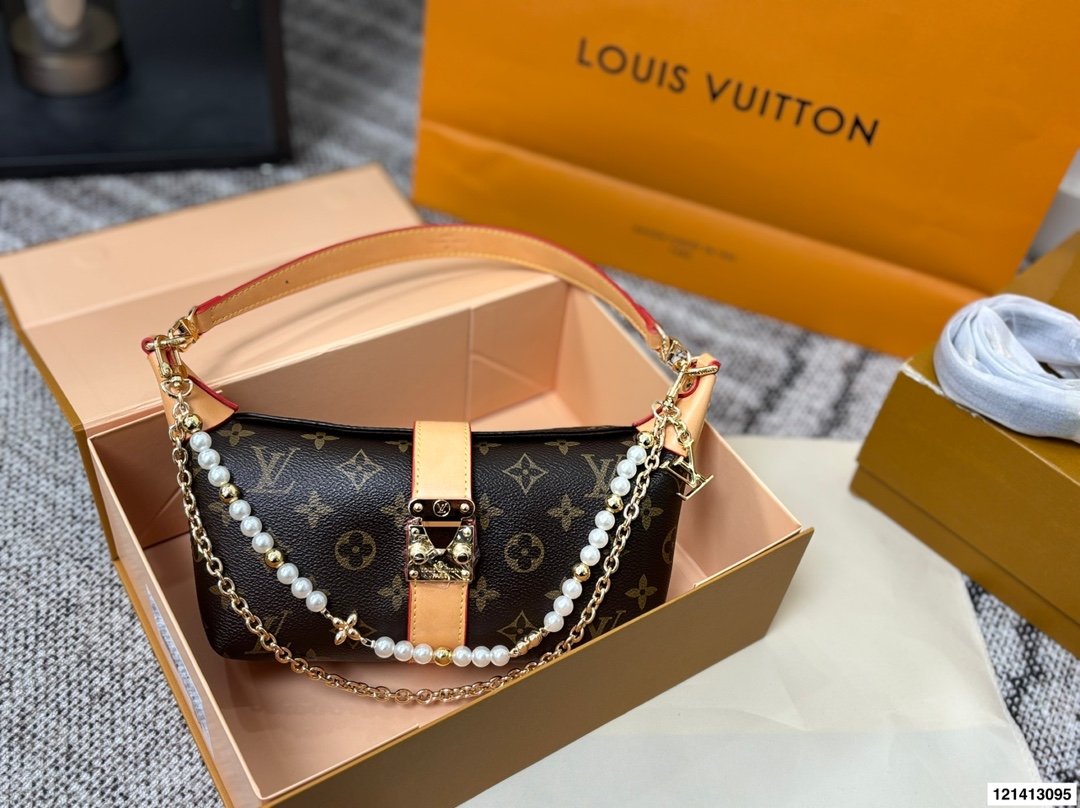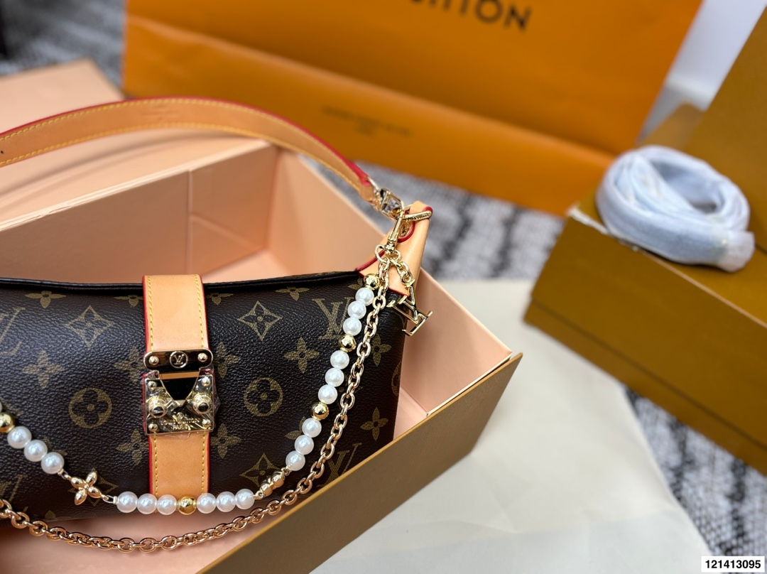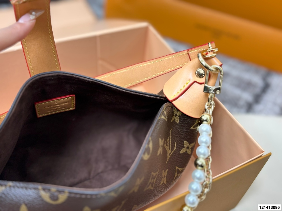 DetailThe LV Pochette Mia handbag features classic Monogram canvas with leather trim, exuding simple elegance. Its spacious interior makes it perfect for commuting and everyday use! The magnetic closure makes accessing your belongings incredibly convenient. The adjustable shoulder strap allows for stylish underarm or crossbody wear, while the pearl chain embellishment adds a touch of understated elegance. The interior lacks internal compartments, so we recommend using an inner pouch to enhance organization and maintain the bag's shape!