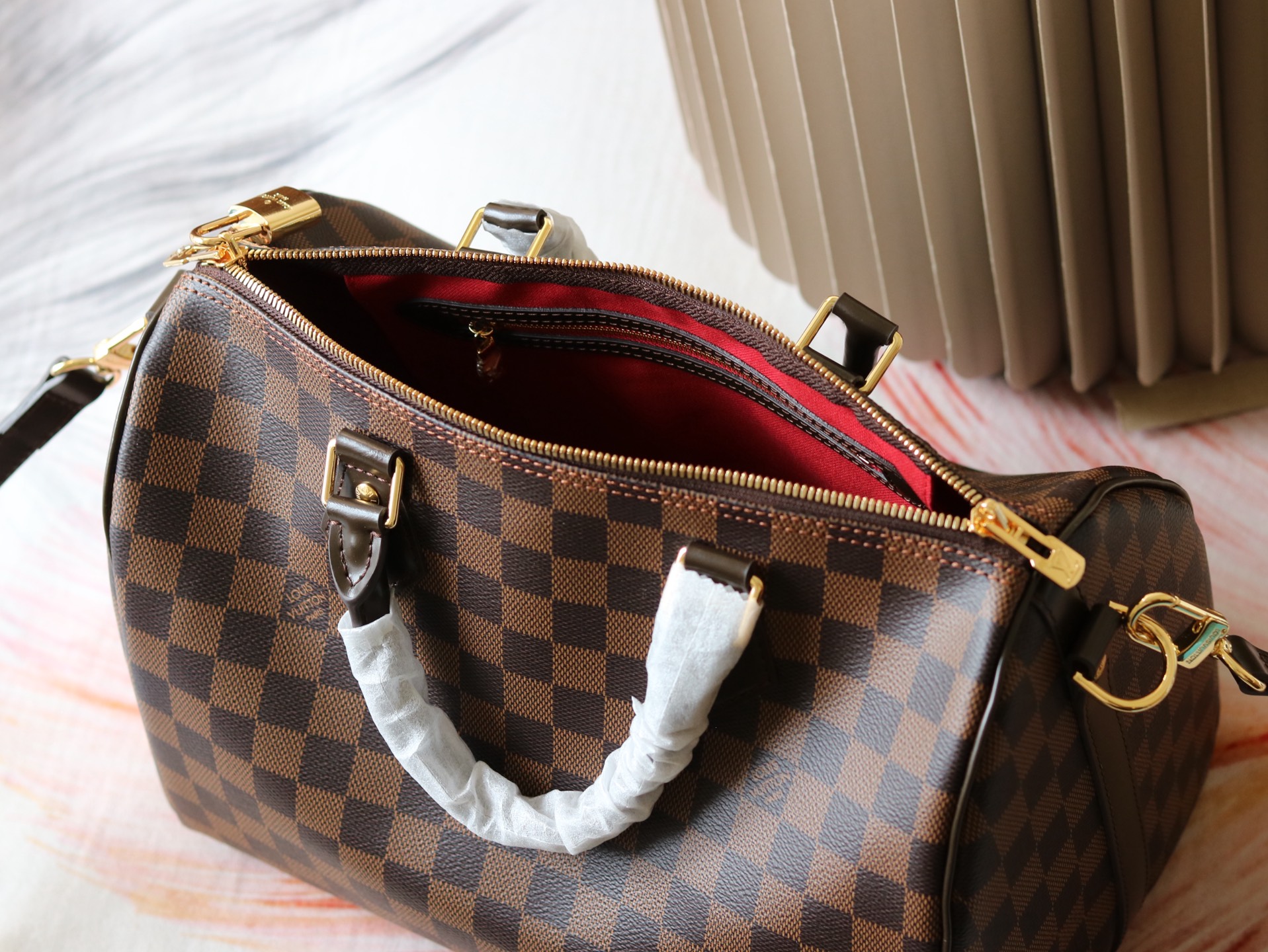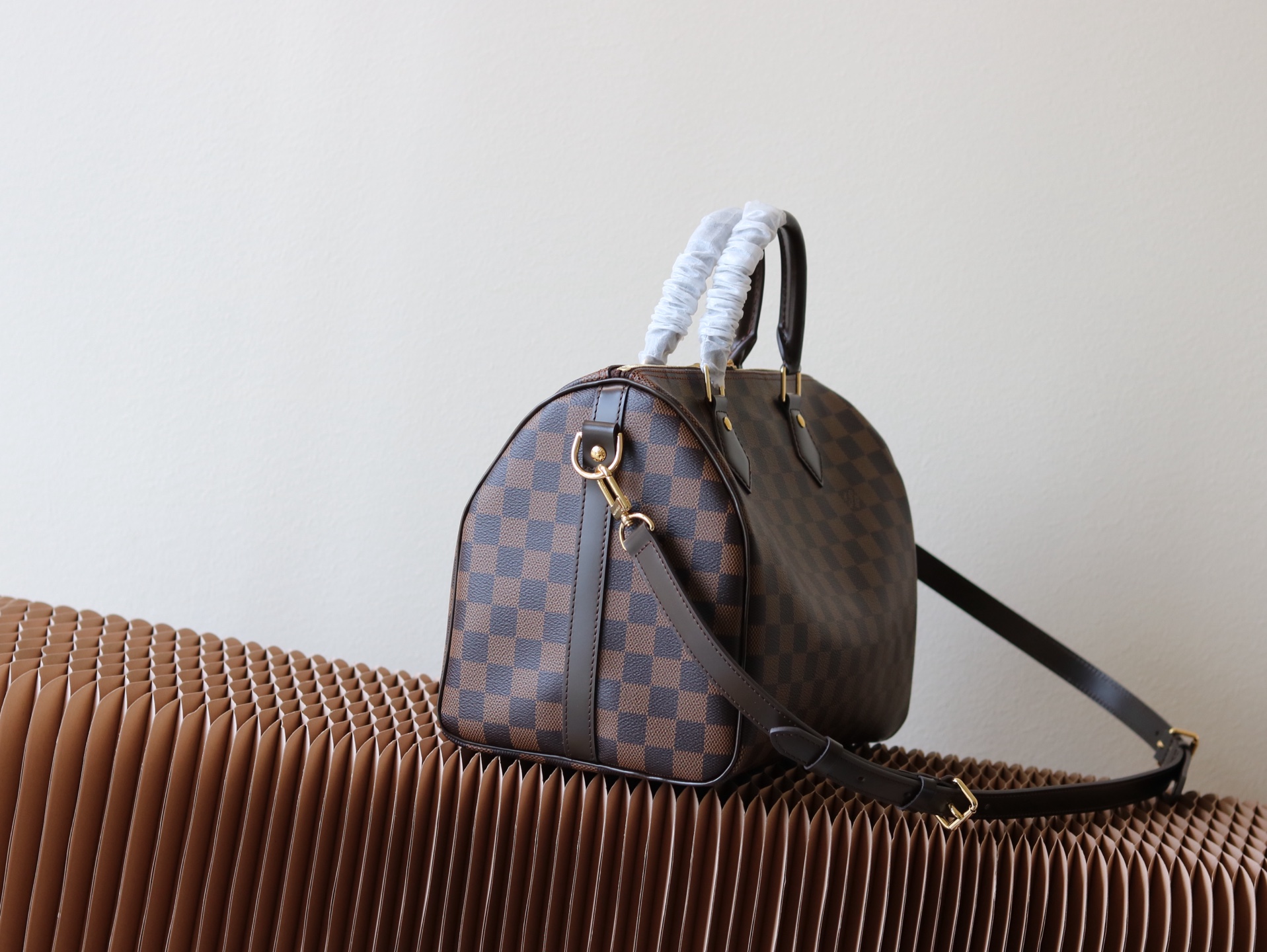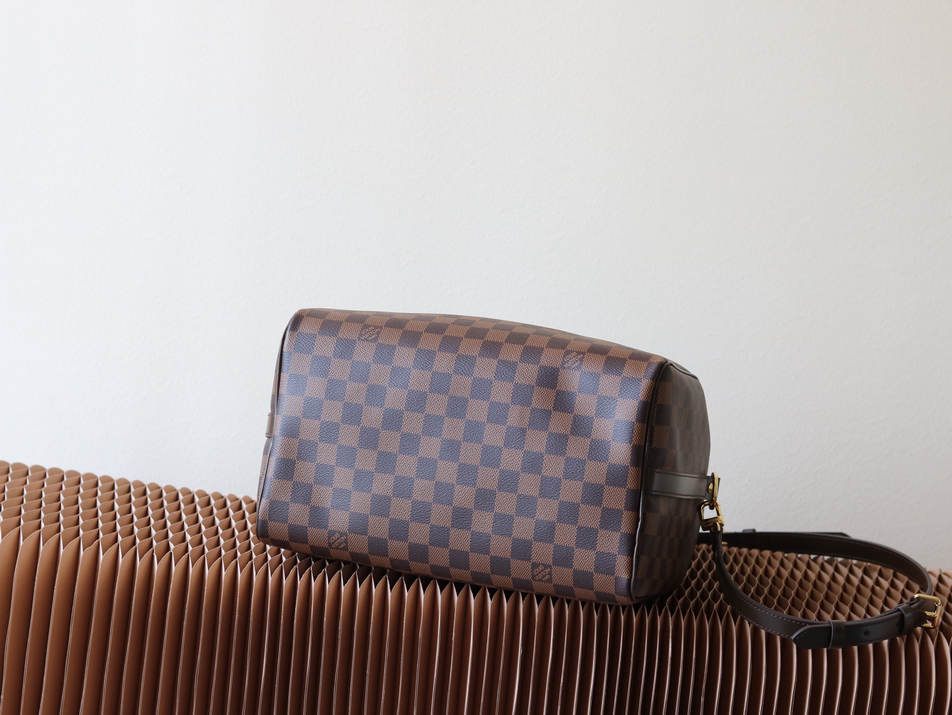 Originally designed for travelers, the Speedy N40590 is named in homage to the rapid transit systems that flourished in the 1930s. Perfect for urban living, the Speedy Bandoulière 30 revisits the iconic shape in elegant Damier Ebene canvas, with rolled leather handles, an inscribed padlock and a removable shoulder strap.