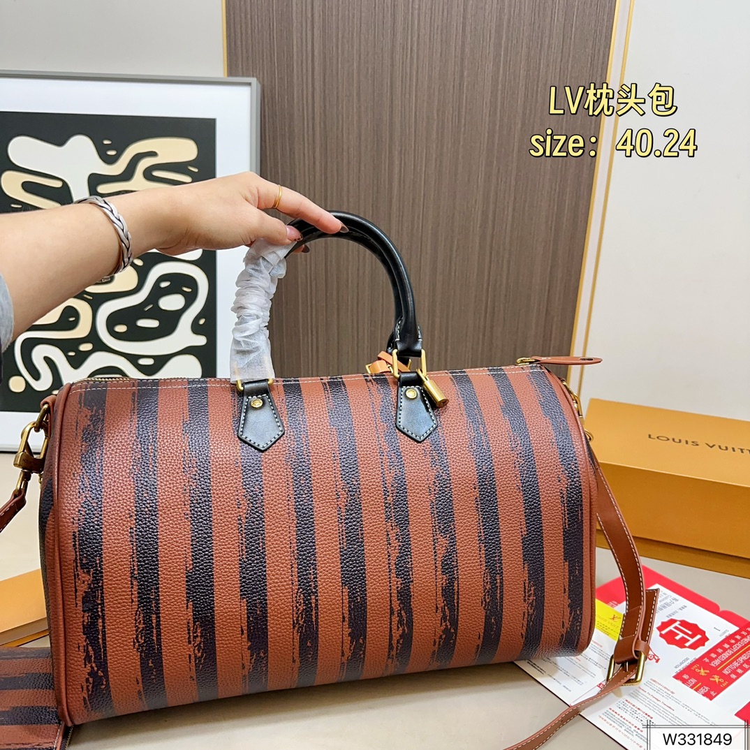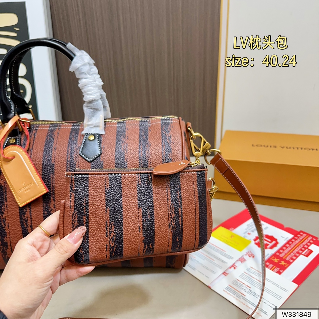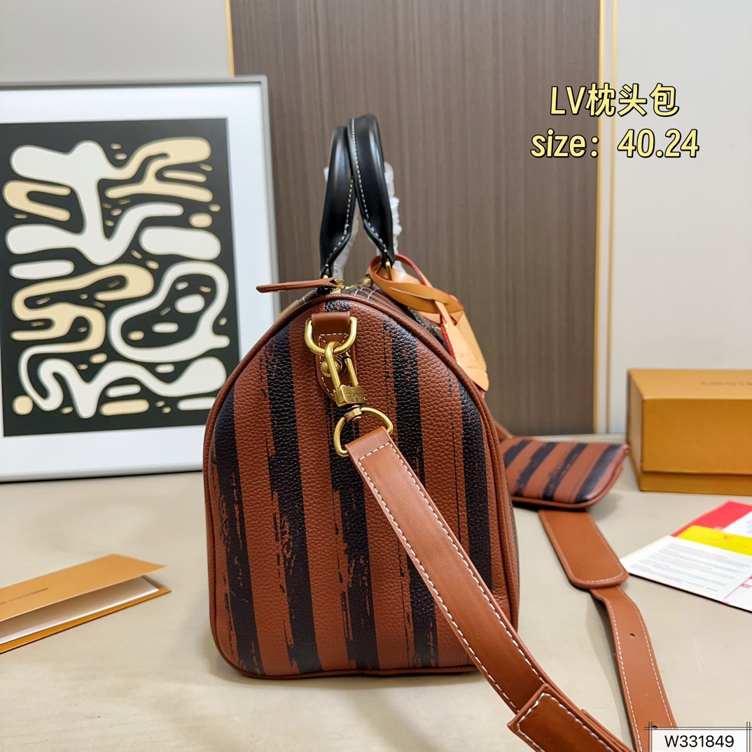 DetailM14064 Coffee Stripe and Khaki Stripe Combination ImageSpeedy Pillow Bag. Monogram elements are featured on printed, imitation canvas. Polished hardware, lining, and an internal logo plaque showcase Creative Director Pharrell Williams' meticulous attention to detail.