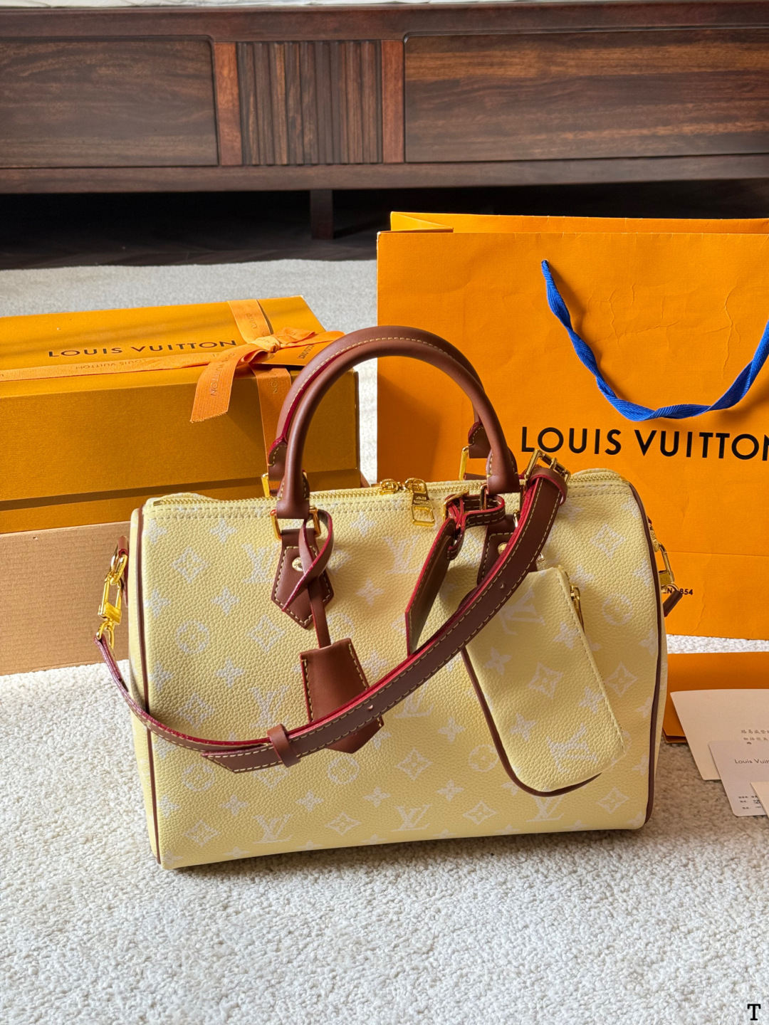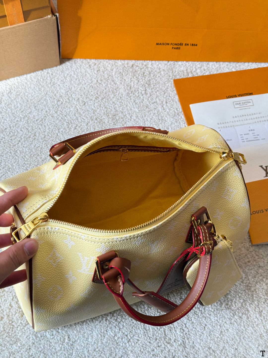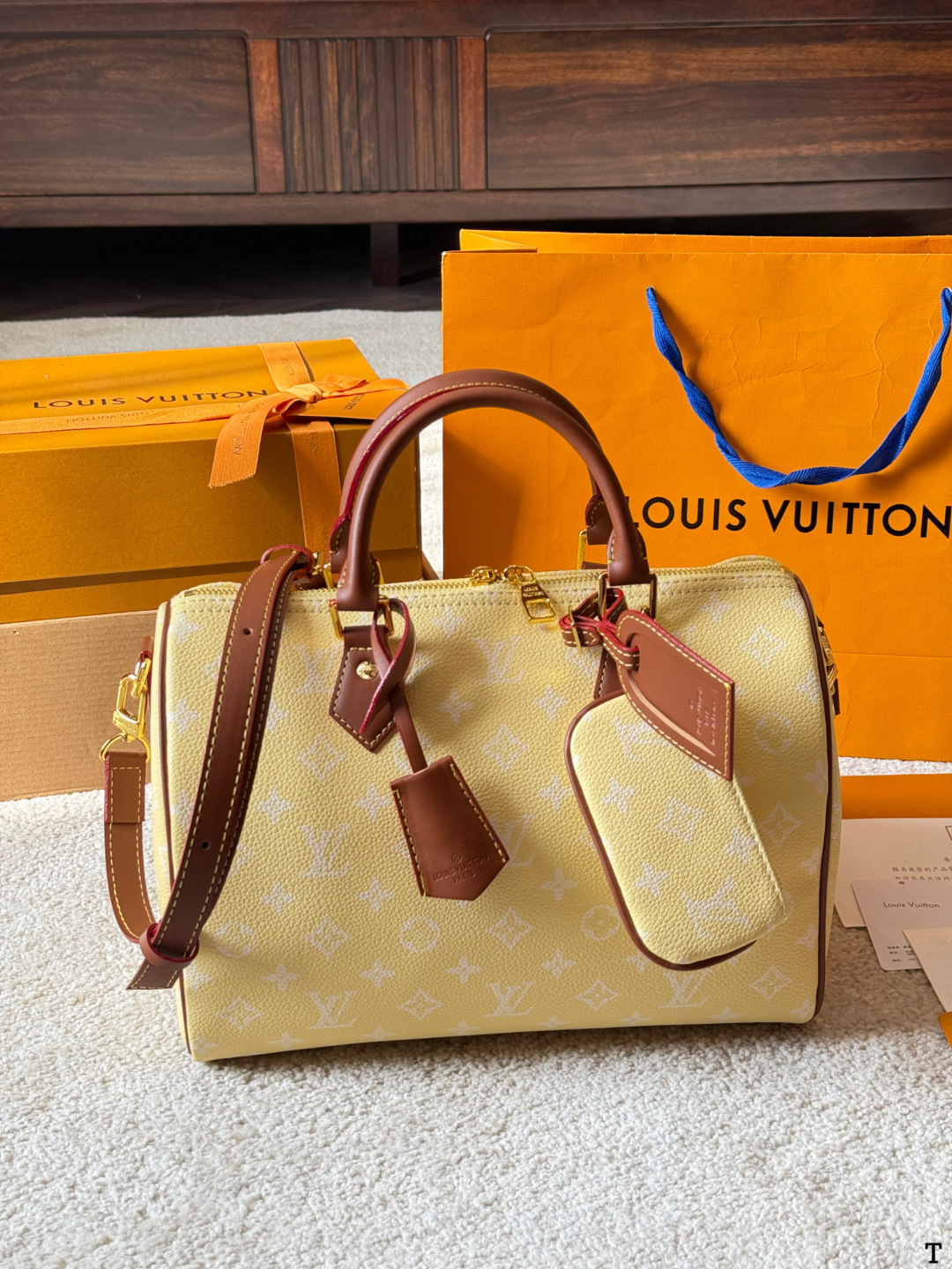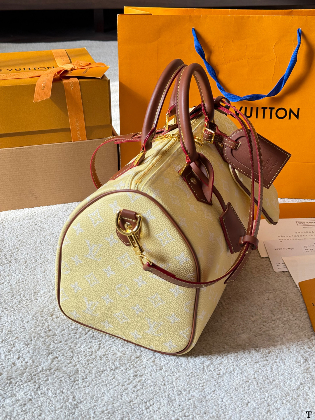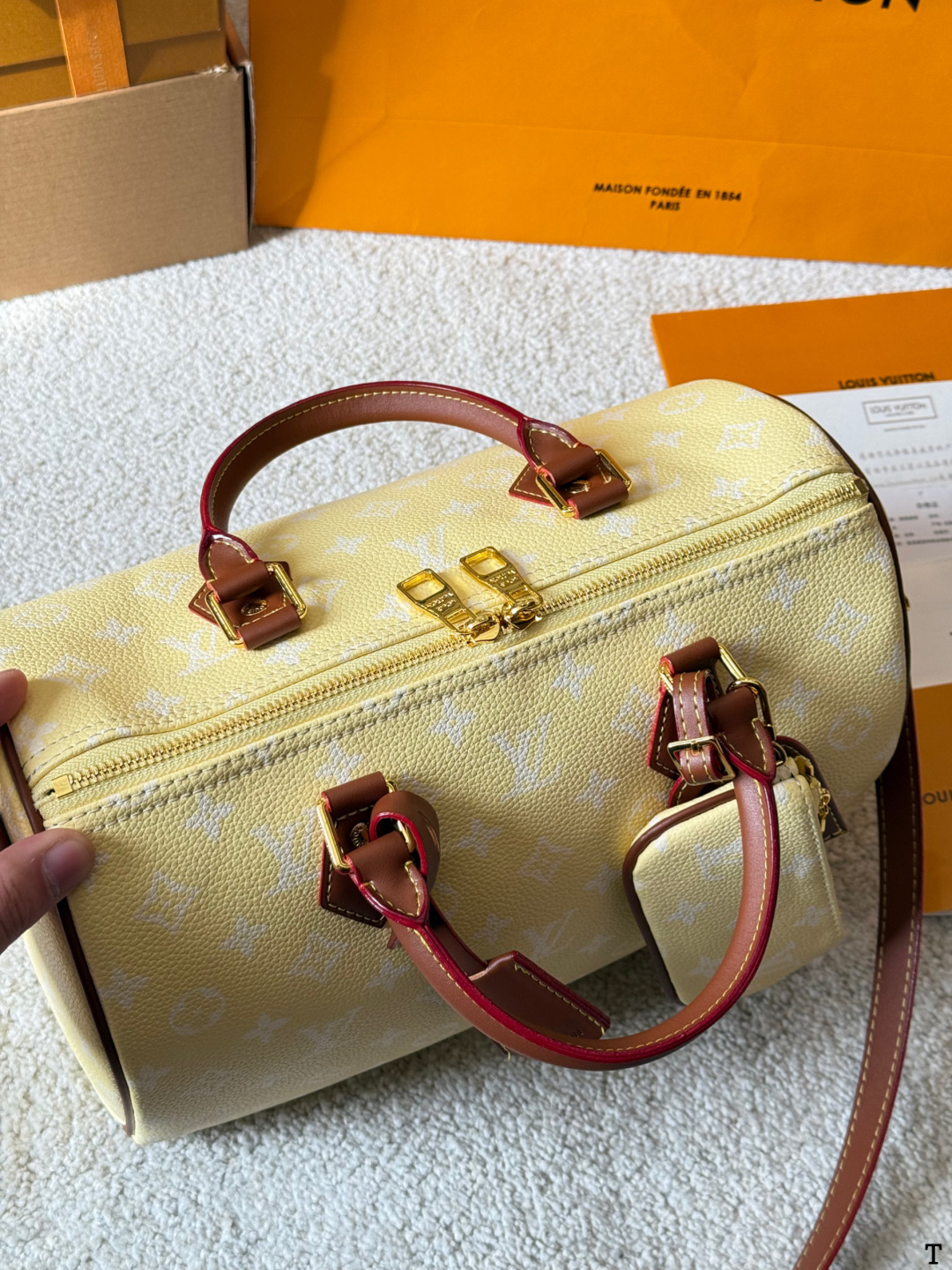 DetailThe LV Speedy P9 yellow handbag is crafted from natural cowhide leather with a Monogram embossed texture, offering a soft and supple feel and exceptional quality. Its classic Boston bag shape and moderate 25cm capacity make it suitable for both work and casual occasions. The vibrant yellow color, paired with brown leather and metal hardware, creates a retro yet stylish look. It can be carried by hand, over the shoulder, or crossbody, making it incredibly versatile. Designed by Williams and Nigo, the Speedy P9 series boasts a rich color palette and exquisite craftsmanship, representing LV's classic design while embracing innovation – a must-have for fashion enthusiasts!