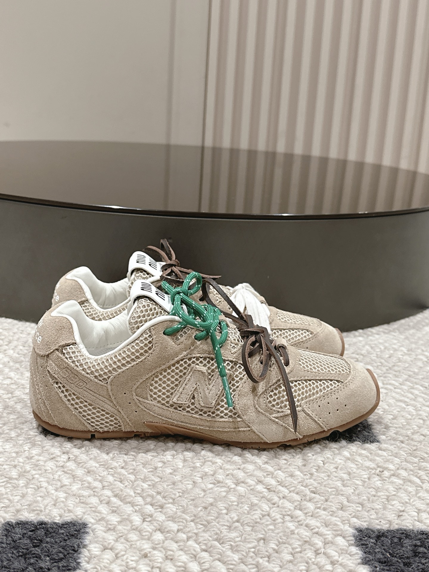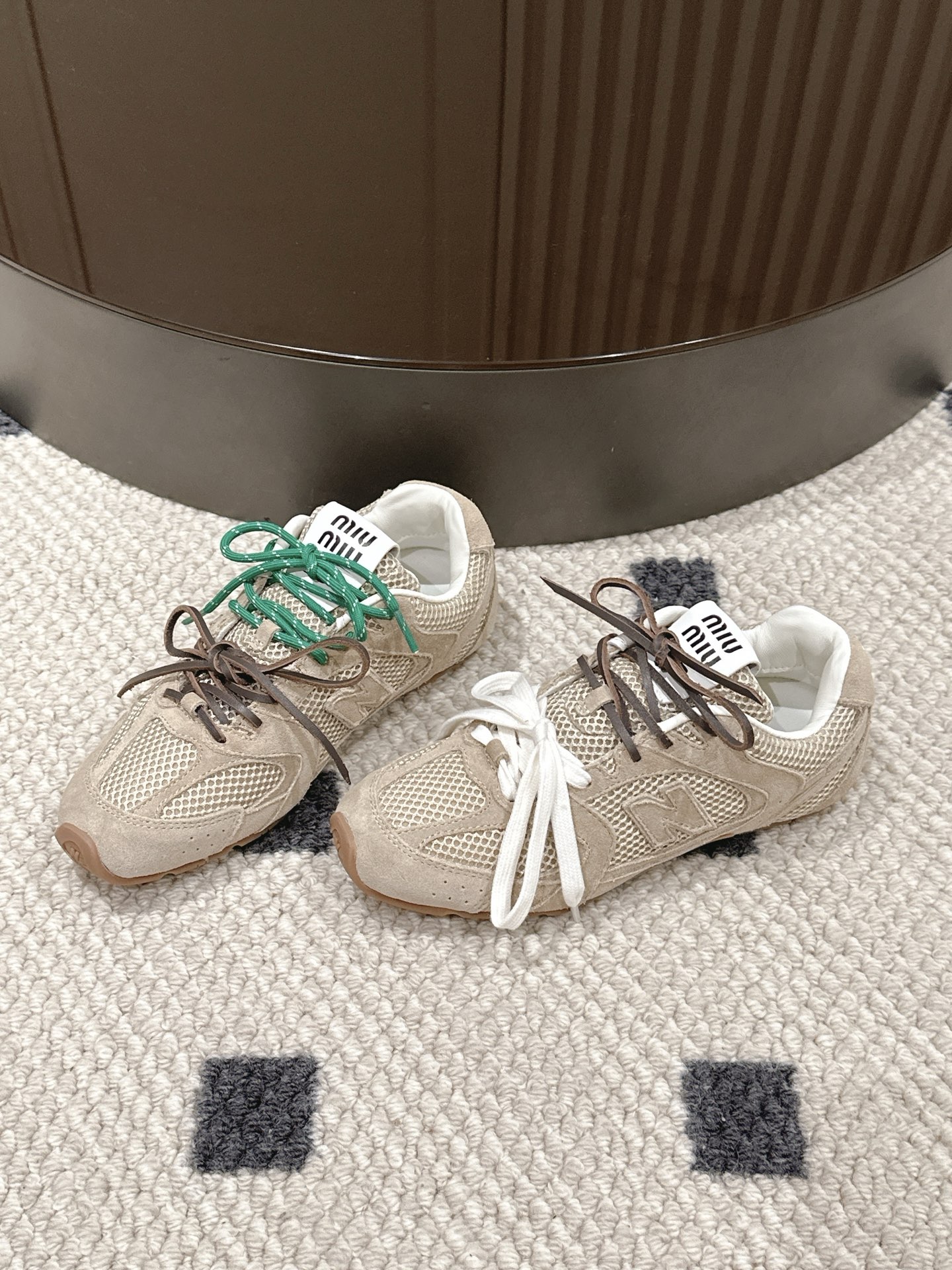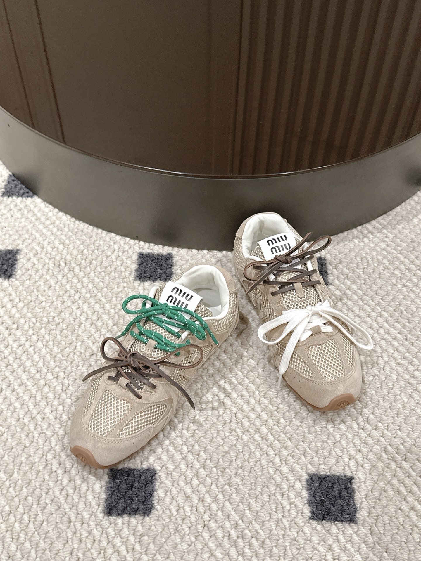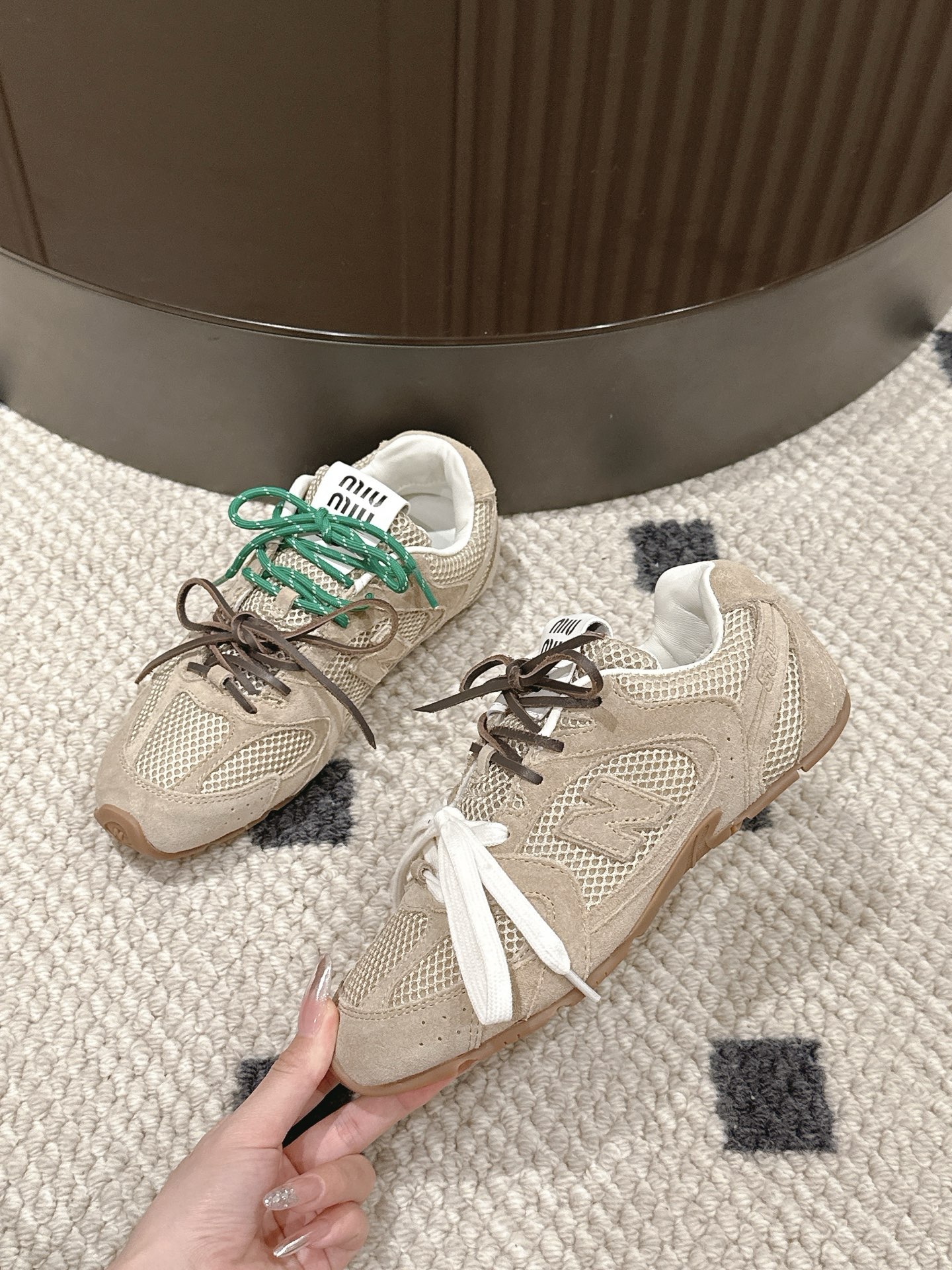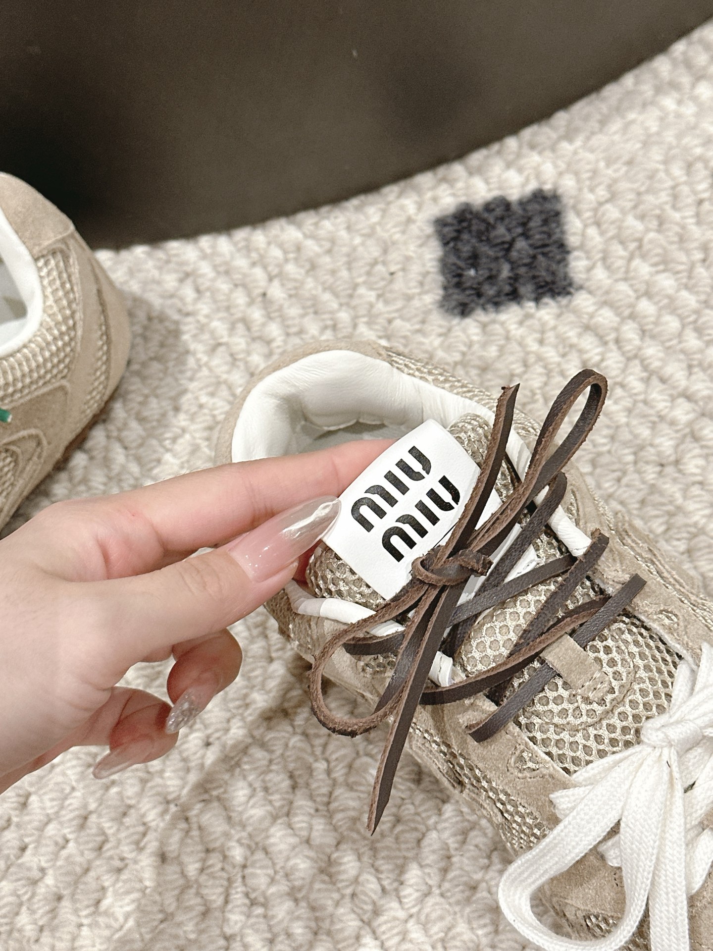 DetailMiu Miu full-top sneakers: Fashion doesn't need to be ostentatious; it exudes effortless style. The mesh upper meets leather, creating a wonderful synergy of breathability and texture. Colorful patchwork, like leaping musical notes, composes a symphony of individuality and vitality. Every step is at the forefront of fashion, releasing the free spirit of the city and leading a carefree and stylish trend.