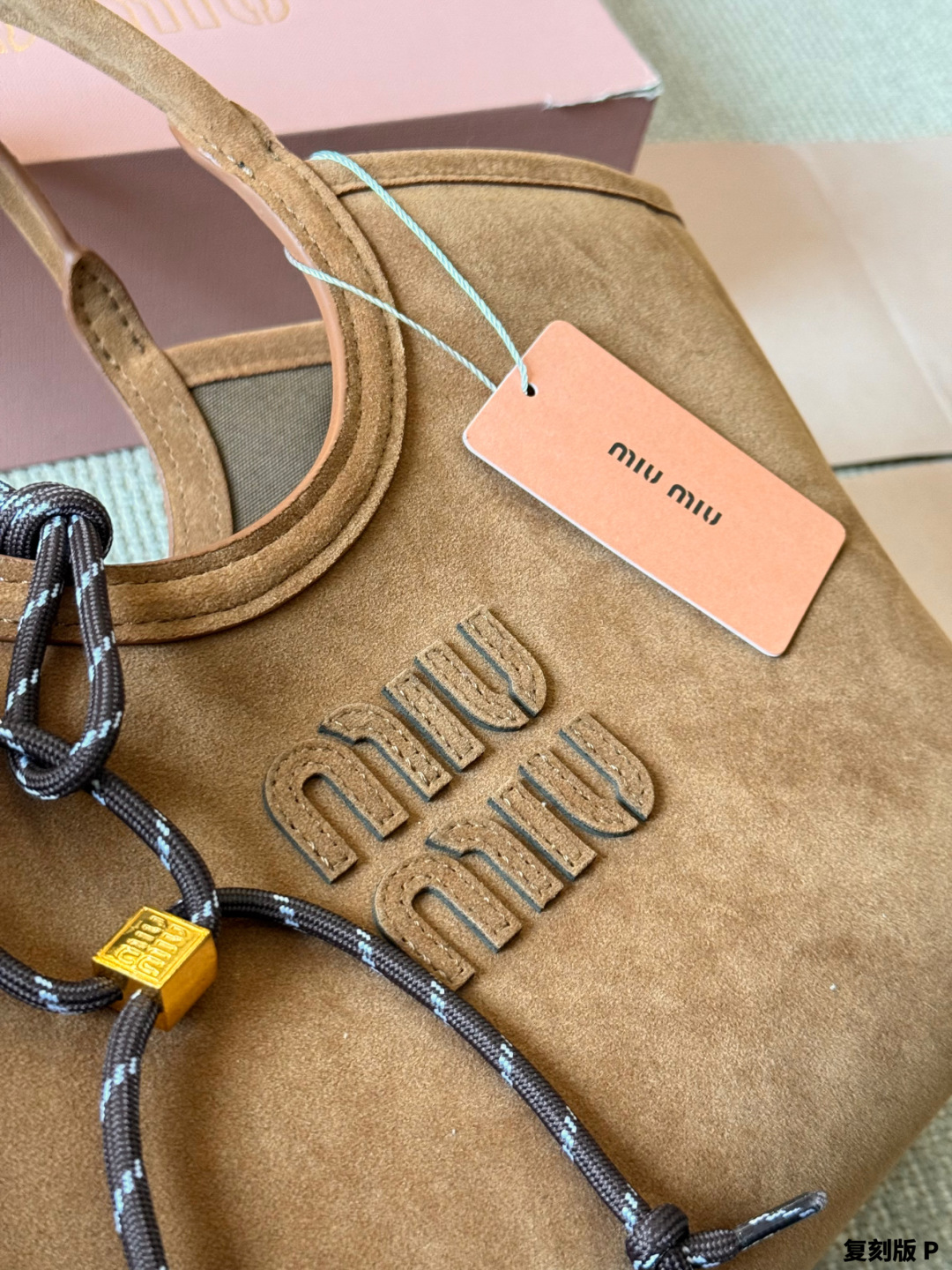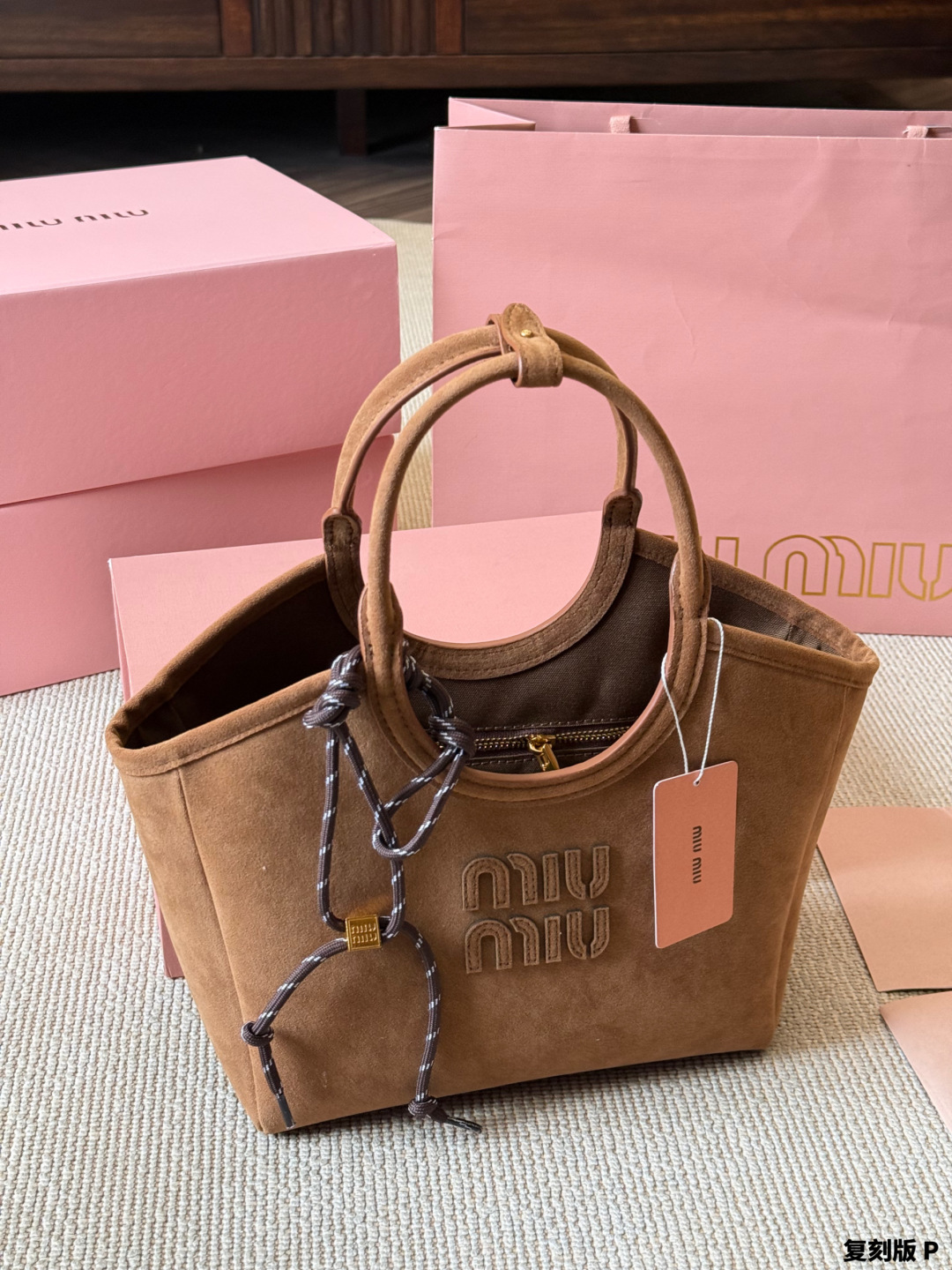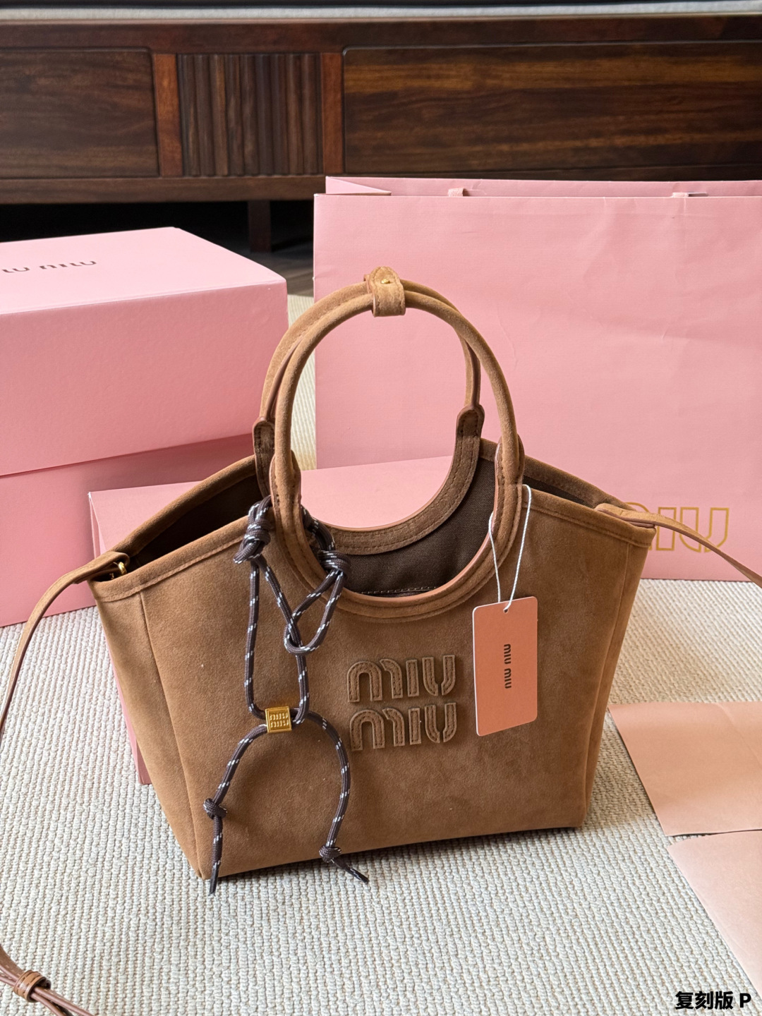 DetailMade of brown suede, it's soft and textured, and features a striking 3D logo on the front. The small size measures approximately 22x19x12cm, perfect for carrying by hand or across the body, and comes with a detachable shoulder strap for versatile styling! The interior is spacious enough for an iPad, making it practical for commuting and everyday wear. Suede is water-resistant and stain-resistant, so it's recommended to use an inner sleeve for added protection. This simple and practical bag is a classic and popular Miu Miu style. It's stylish and practical, and I highly recommend it!