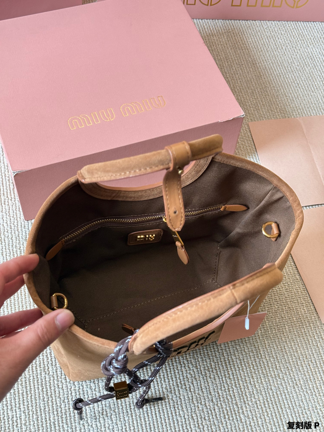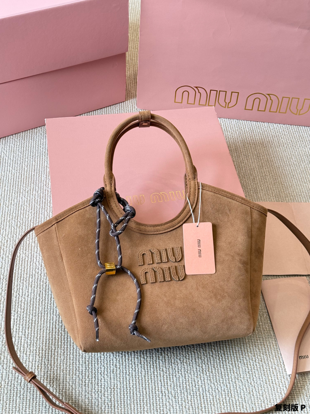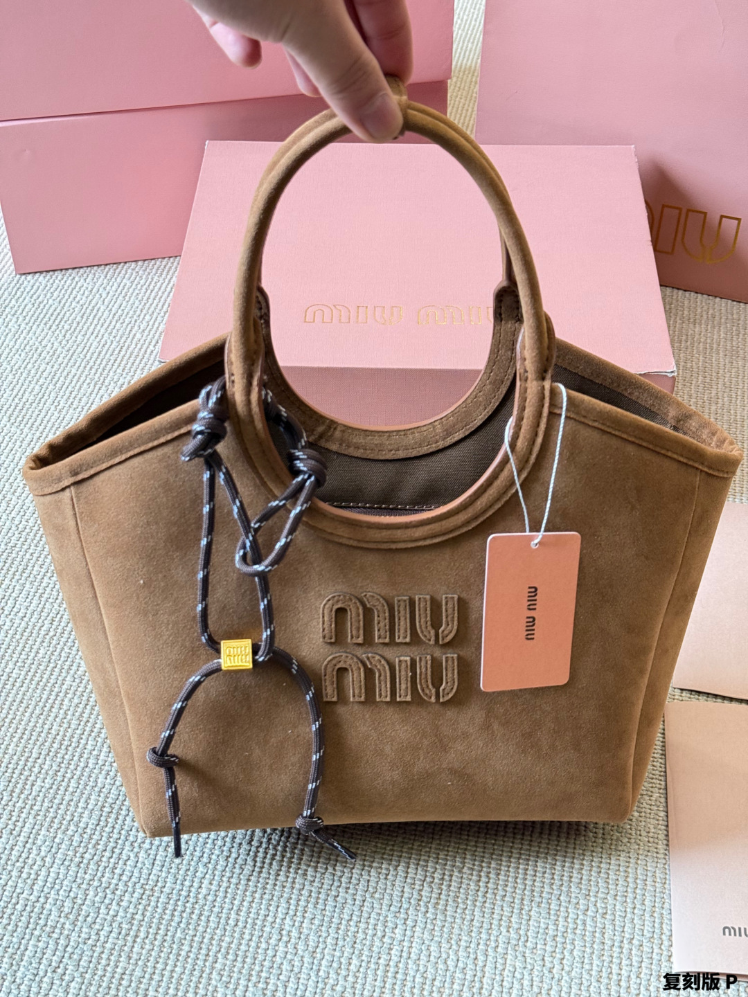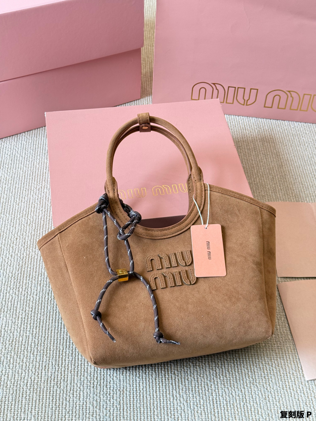 DetailMade of brown suede, it's soft and textured, and features a striking 3D logo on the front. The small size measures approximately 22x19x12cm, perfect for carrying by hand or across the body, and comes with a detachable shoulder strap for versatile styling! The interior is spacious enough for an iPad, making it practical for commuting and everyday wear. Suede is water-resistant and stain-resistant, so it's recommended to use an inner sleeve for added protection. This simple and practical bag is a classic and popular Miu Miu style. It's stylish and practical, and I highly recommend it!