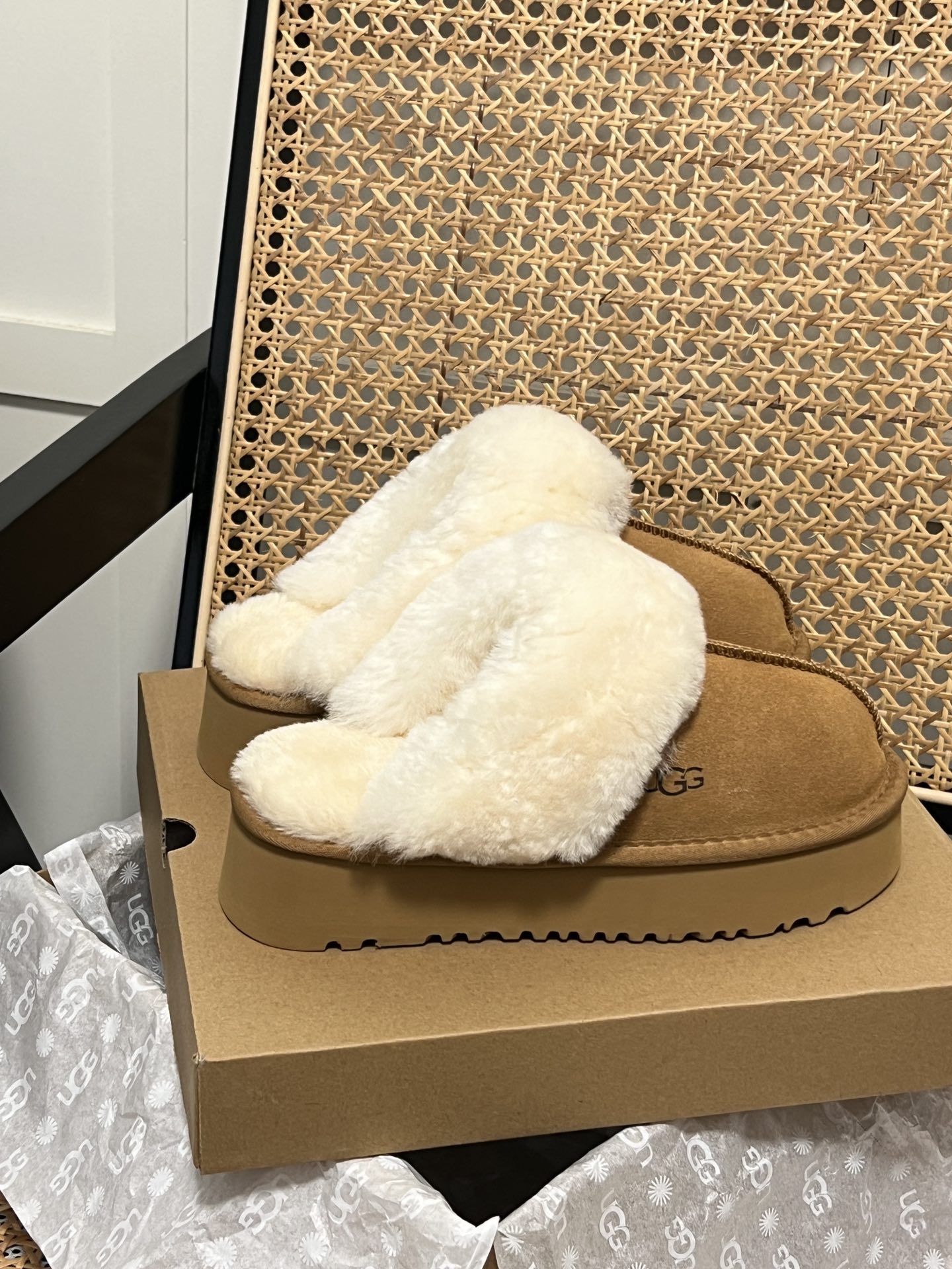 Fabric: Leather and fur with a foam sole.